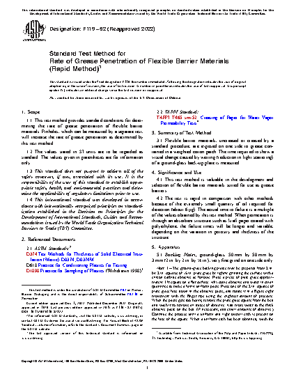 1.1 This test method provides standard conditions for determining the rate of grease penetration of flexible barrier materials. Pinholes, which can be measured by a separate test, will increase the rate of grease penetration as determined by this test method.
