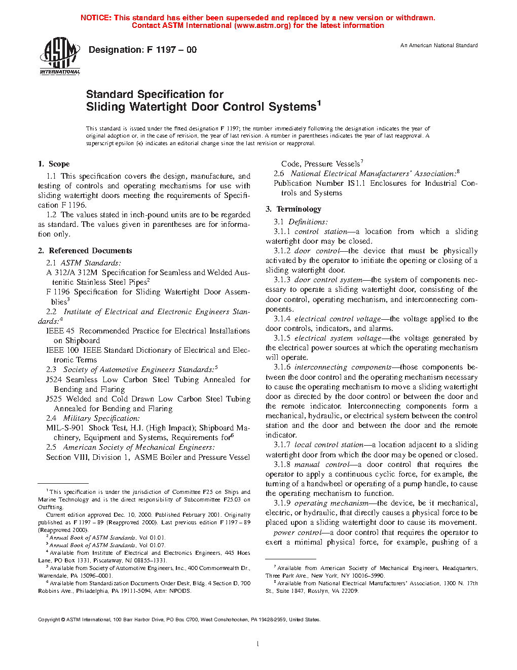 1.1 This specification covers the design, manufacture, and testing of controls and operating mechanisms for use with sliding watertight doors meeting the requirements of Specification F1196.