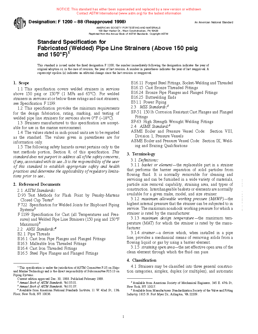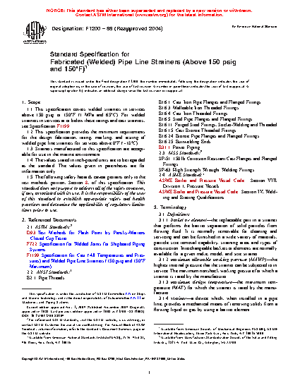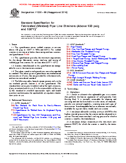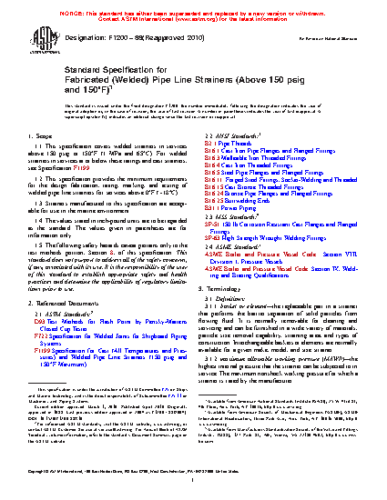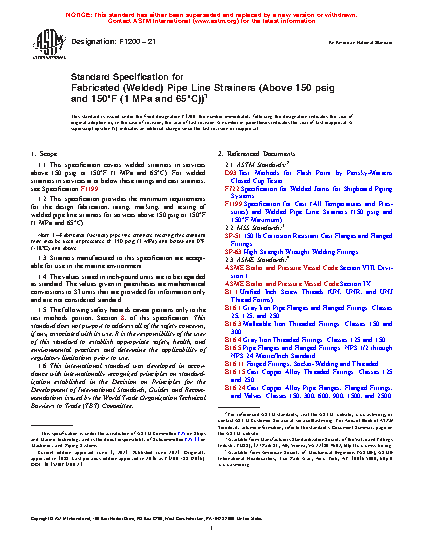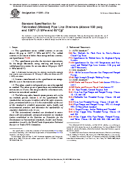 1.1 This specification covers welded strainers in services above 150 psig or 150°F (1 MPa and 65°C). For welded strainers in services at or below these ratings and cast strainers, see Specification F1199.