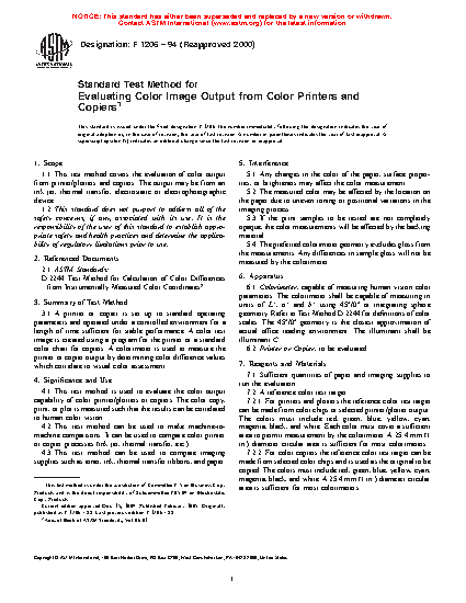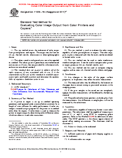 This test method is used to evaluate the color output capability of color printer/plotters or copiers. The color copy, print, or plot is measured such that the results can be correlated to human color vision.