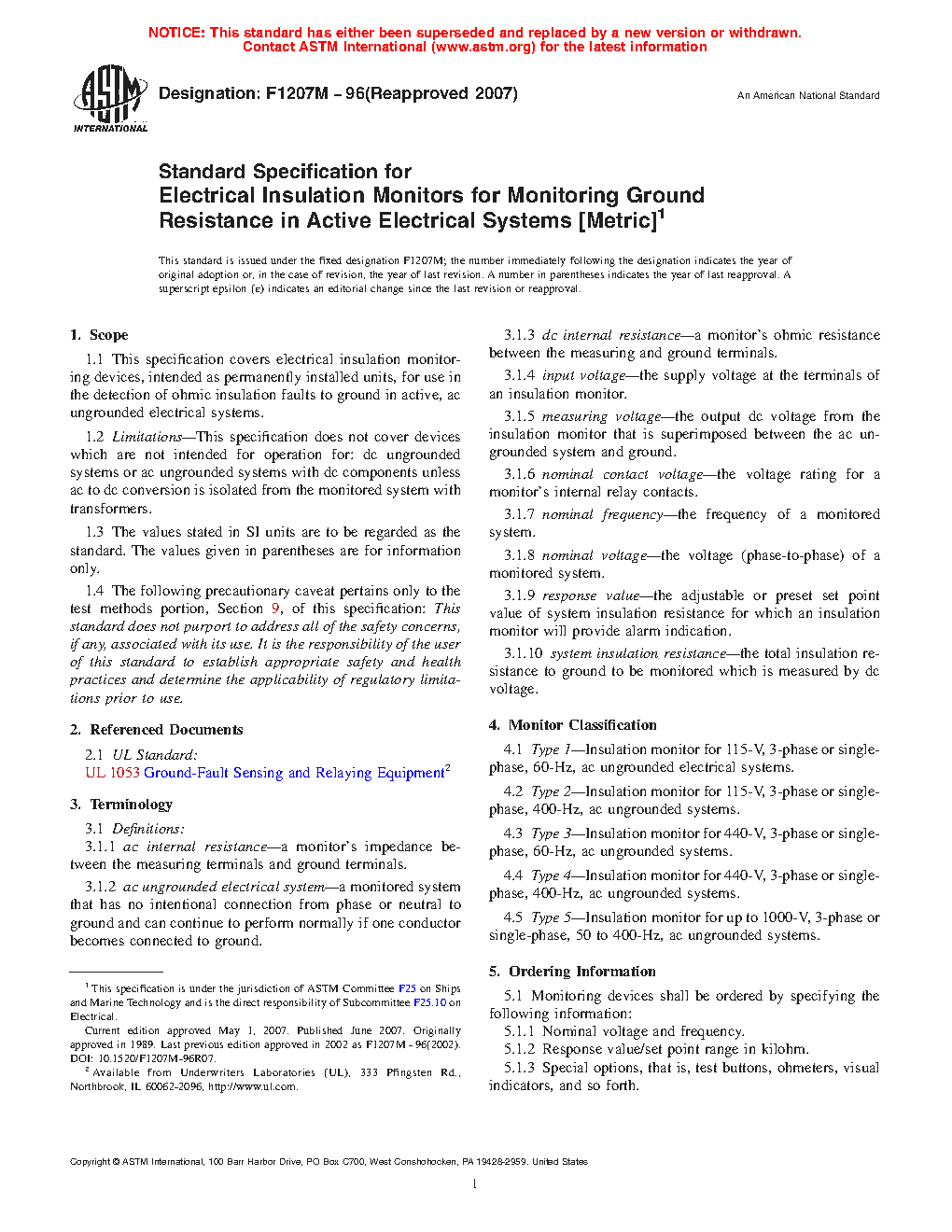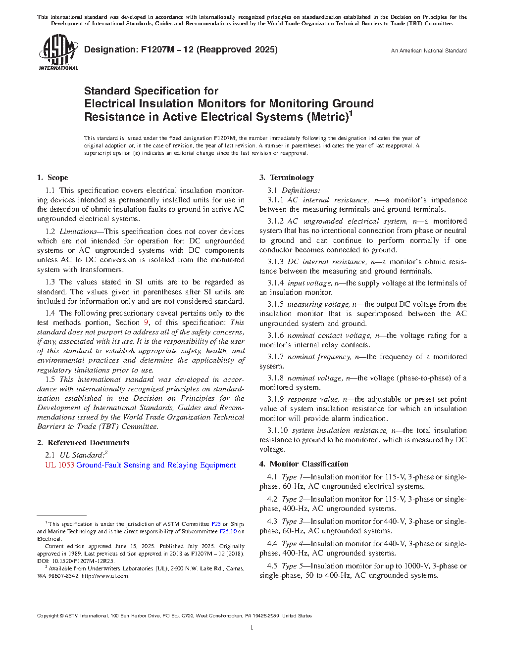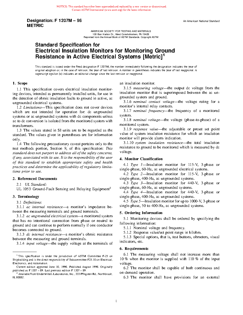 This specification covers the requirements and testing procedures for five types of electrical insulation monitoring devices intended as permanently installed units that are used in the detection of ohmic insulation faults to ground in active AC ungrounded electrical systems. This specification does not address devices which are not intended for DC or AC ungrounded systems that operated with DC components, unless AC to DC conversion is isolated from the monitored system with transformers. Information required in the equipment manual that shall be provided with this system are also detailed.