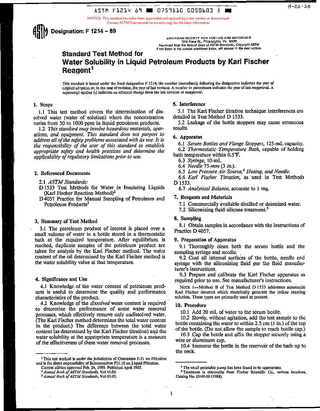 Test Method for Water Solubility in Liquid Petroleum Products by Karl Fischer Reagent (Withdrawn 1998)