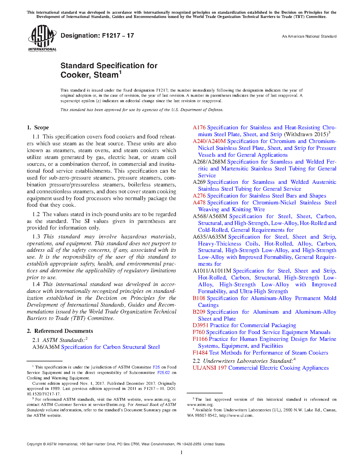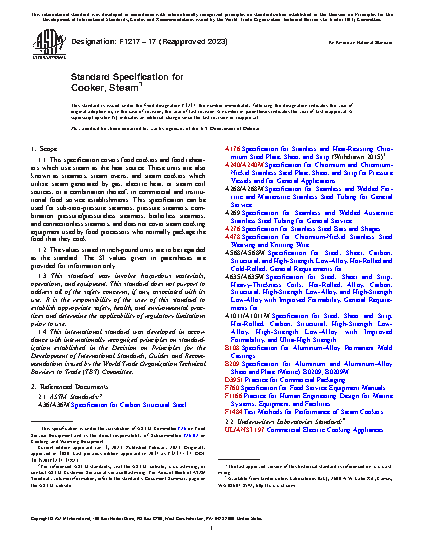 1.1 This specification covers food cookers and food reheaters which use steam as the heat source. These units are also known as steamers, steam ovens, and steam cookers which utilize steam generated by gas, electric heat, or steam coil sources, or a combination thereof, in commercial and institutional food service establishments. This specification can be used for sub-zero-pressure steamers, pressure steamers, combination pressure/pressureless steamers, boilerless steamers, and connectionless steamers, and does not cover steam cooking equipment used by food processors who normally package the food that they cook.