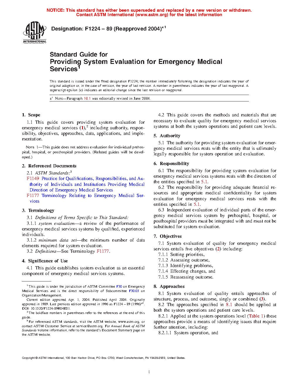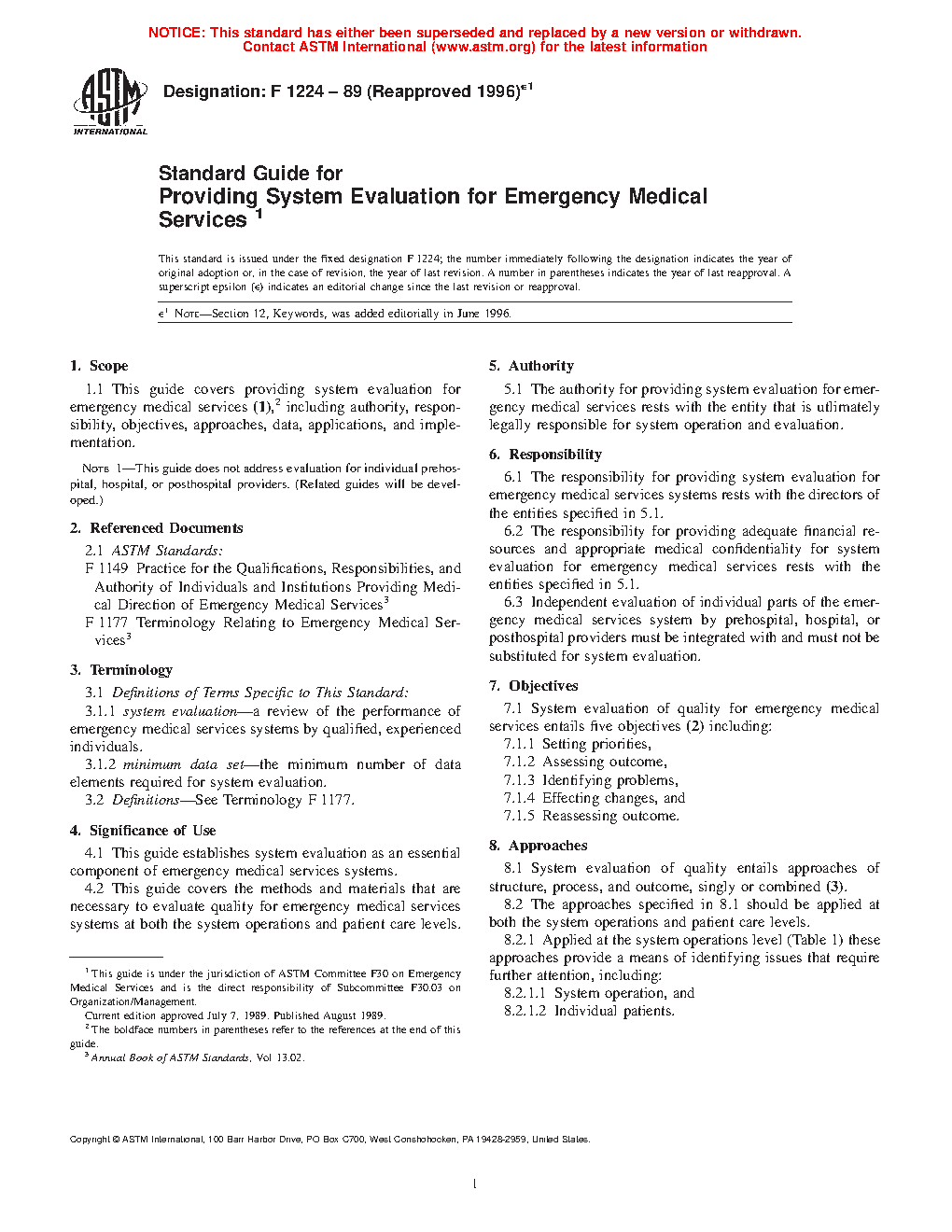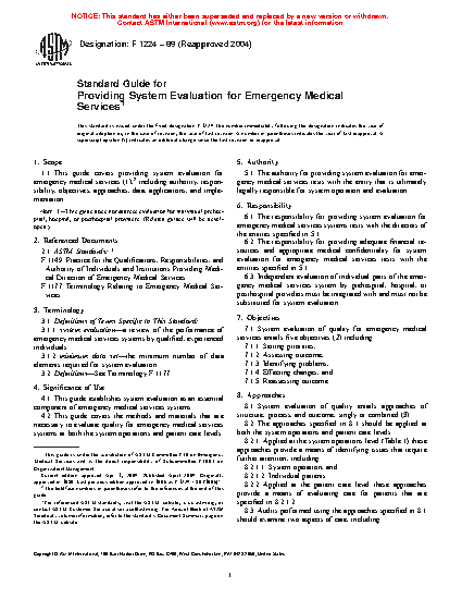 1.1 This guide covers providing system evaluation for emergency medical services including authority, responsibility, objectives, approaches, data, applications, and implementation.