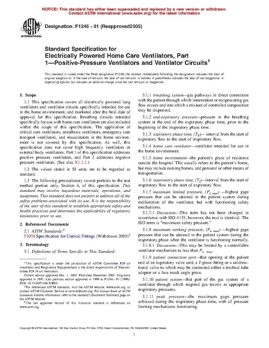This specification covers all electrically powered lung ventilators and ventilator circuits specifically intended for use in the home environment, breathing circuits intended specifically for use with home care ventilators are also included. The test methods for power source requirements; accuracy of controls, indicators, and pressure relief devices; human factor requirements; breathing circuit requirements; alarm requirements; and anti-asphyxia valve and negative pressure relief valves requirements are presented in details.
