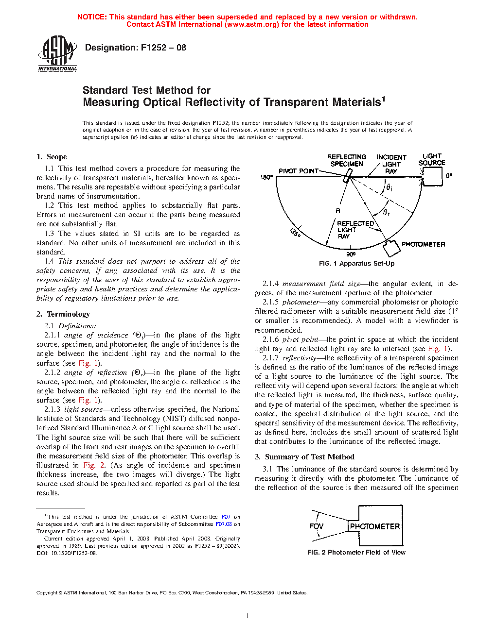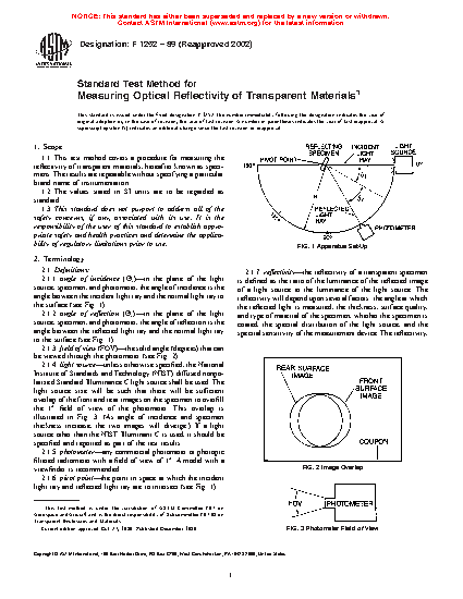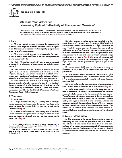 1.1 This test method covers a procedure for measuring the reflectivity of transparent materials, hereafter known as specimens. The results are repeatable without specifying a particular brand name of instrumentation.