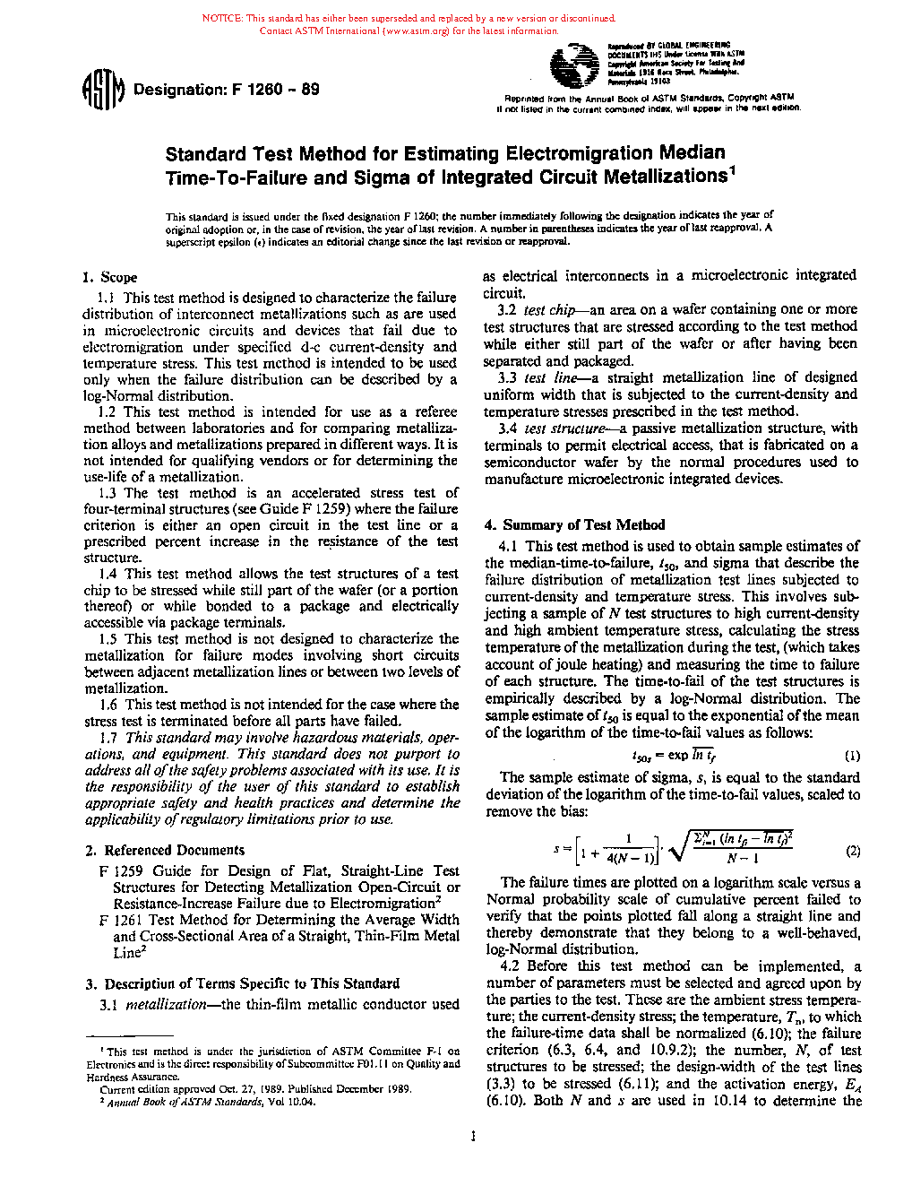 1.3 The test method is an accelerated stress test of four-terminal structures (see Guide F1259) where the failure criterion is either an open circuit in the test line or a prescribed percent increase in the resistance of the test structure.