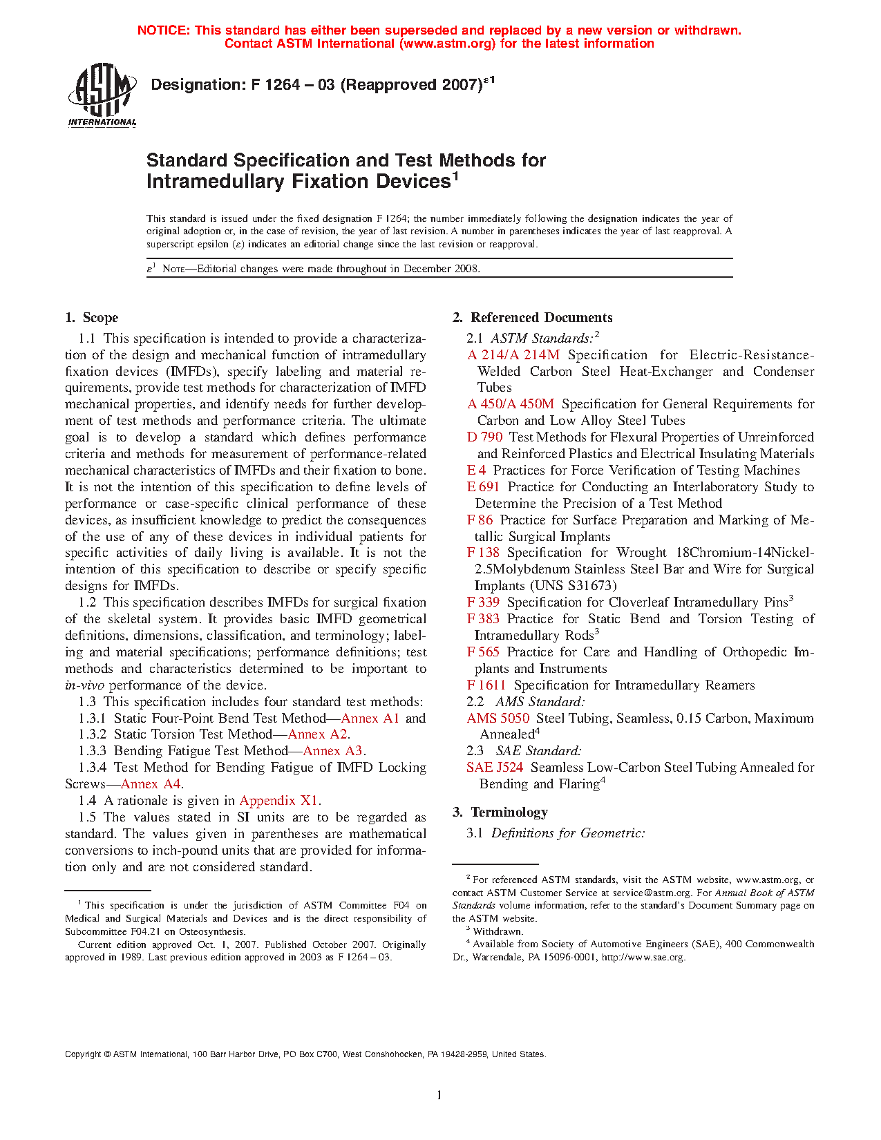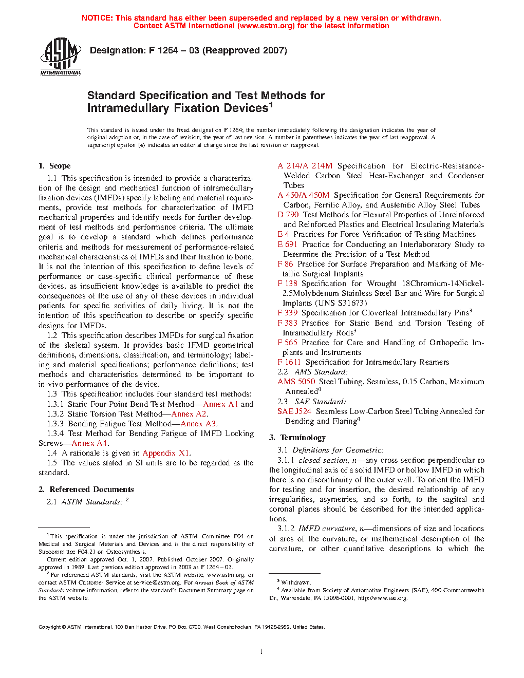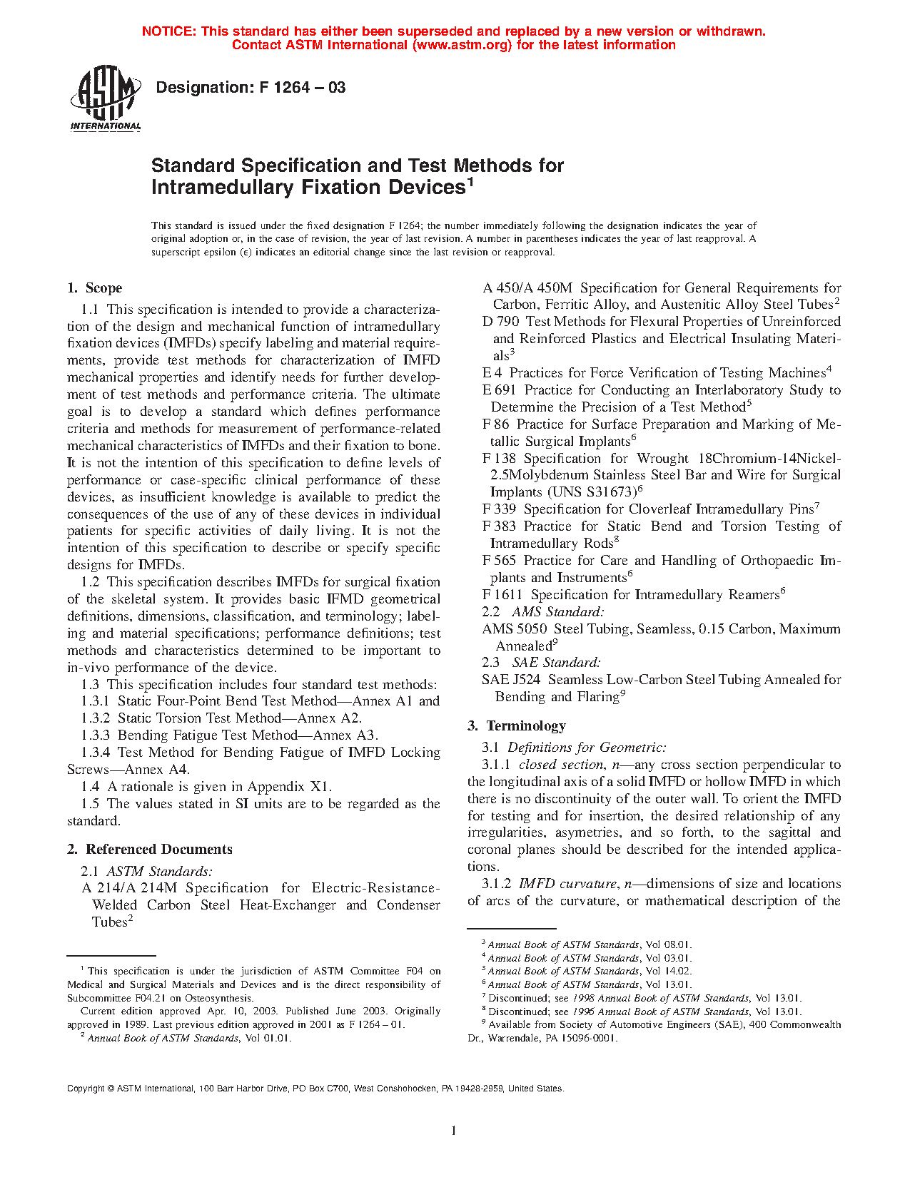1.2 This specification describes IMFDs for surgical fixation of the skeletal system. It provides basic IMFD geometrical definitions, dimensions, classification, and terminology; labeling and material specifications; performance definitions; test methods and characteristics determined to be important to in-vivo performance of the device.