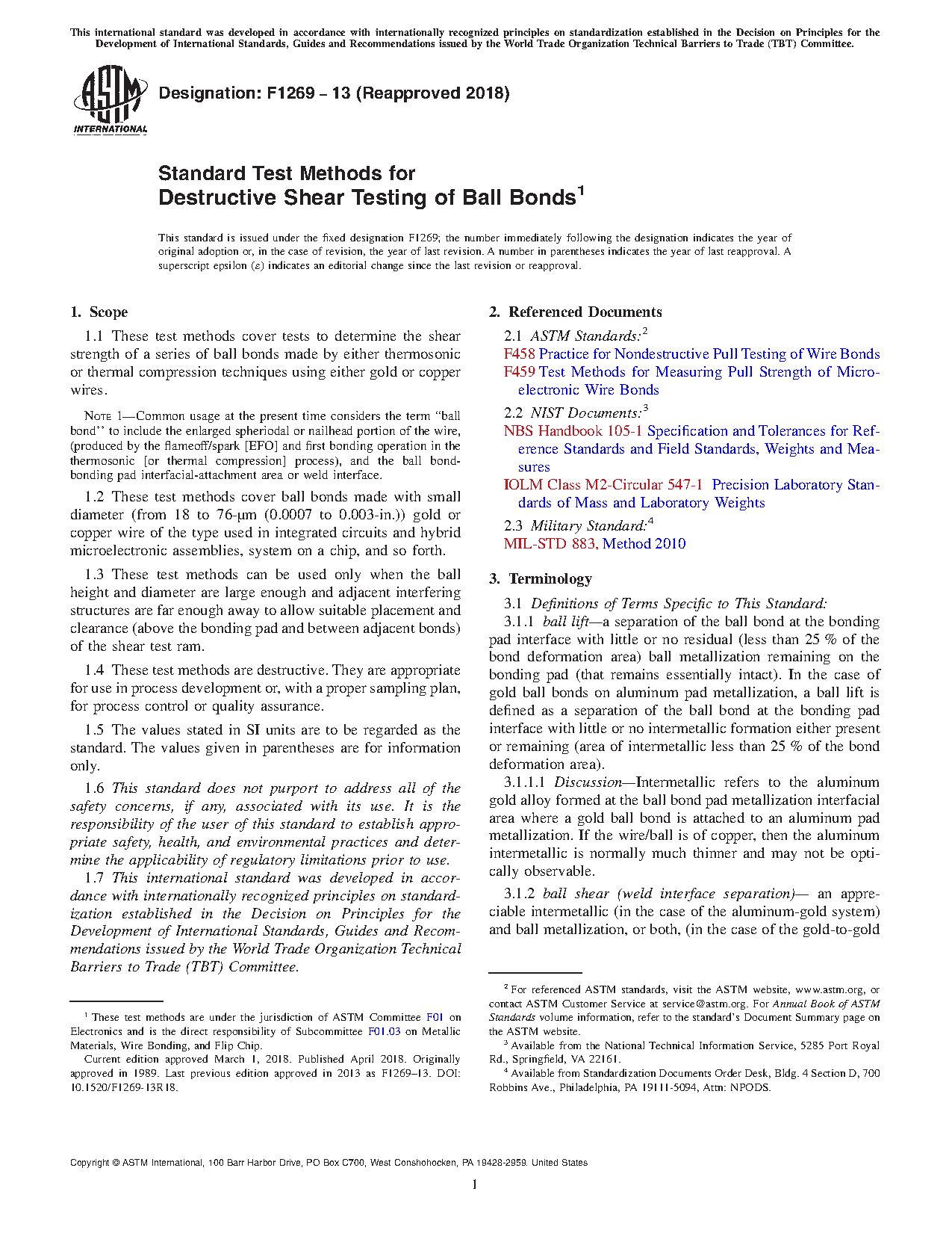 5.1 Failure of microelectronic devices is often due to the failure of an interconnection bond. The most common type of interconnection bond is the thermosonic gold or copper wire bond. A very important element of this interconnection is the first bond or ball bond. These test methods can assist in maintaining control of the process for making ball bonds. They can be used to distinguish between weak and nonadherent ball bonds, of both, and bonds that are acceptably strong.