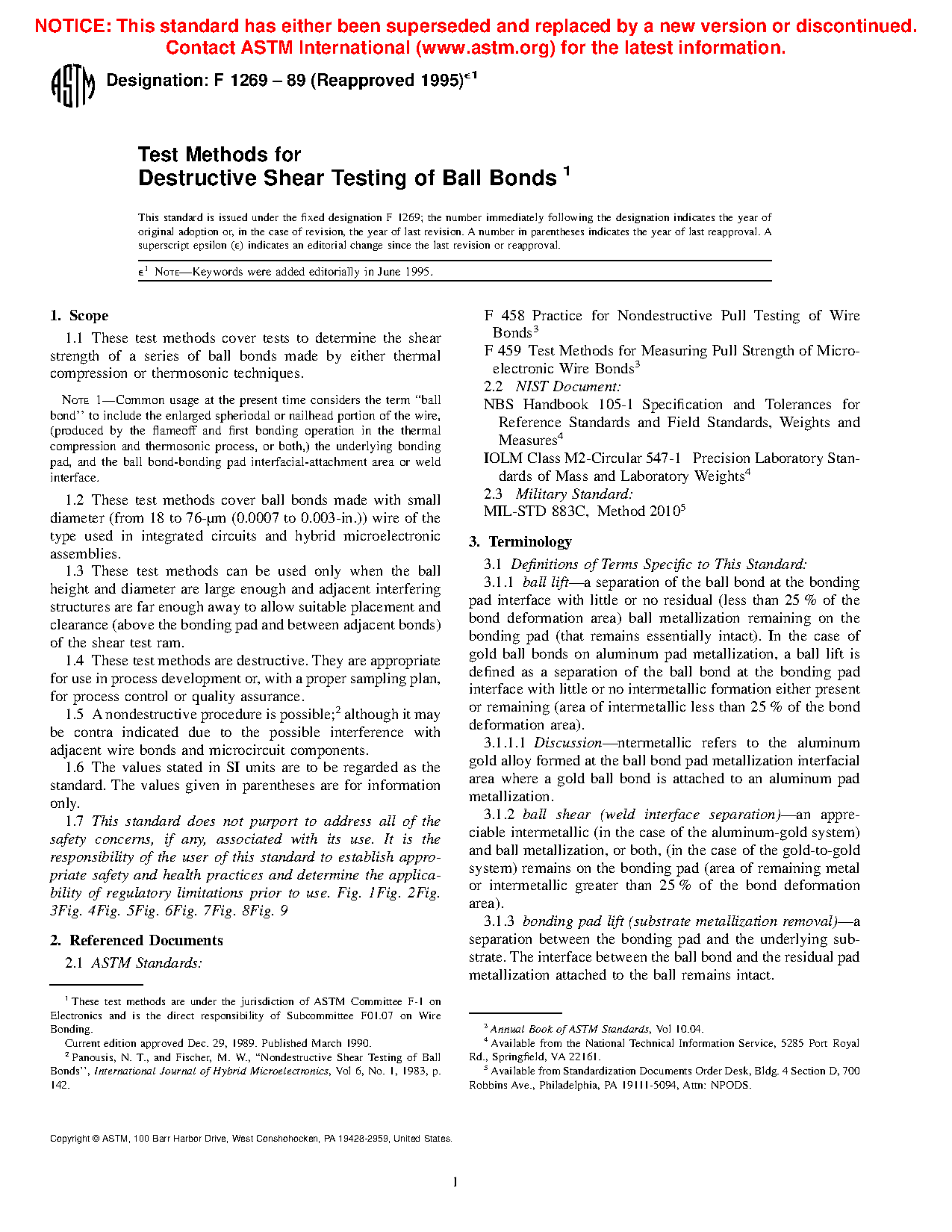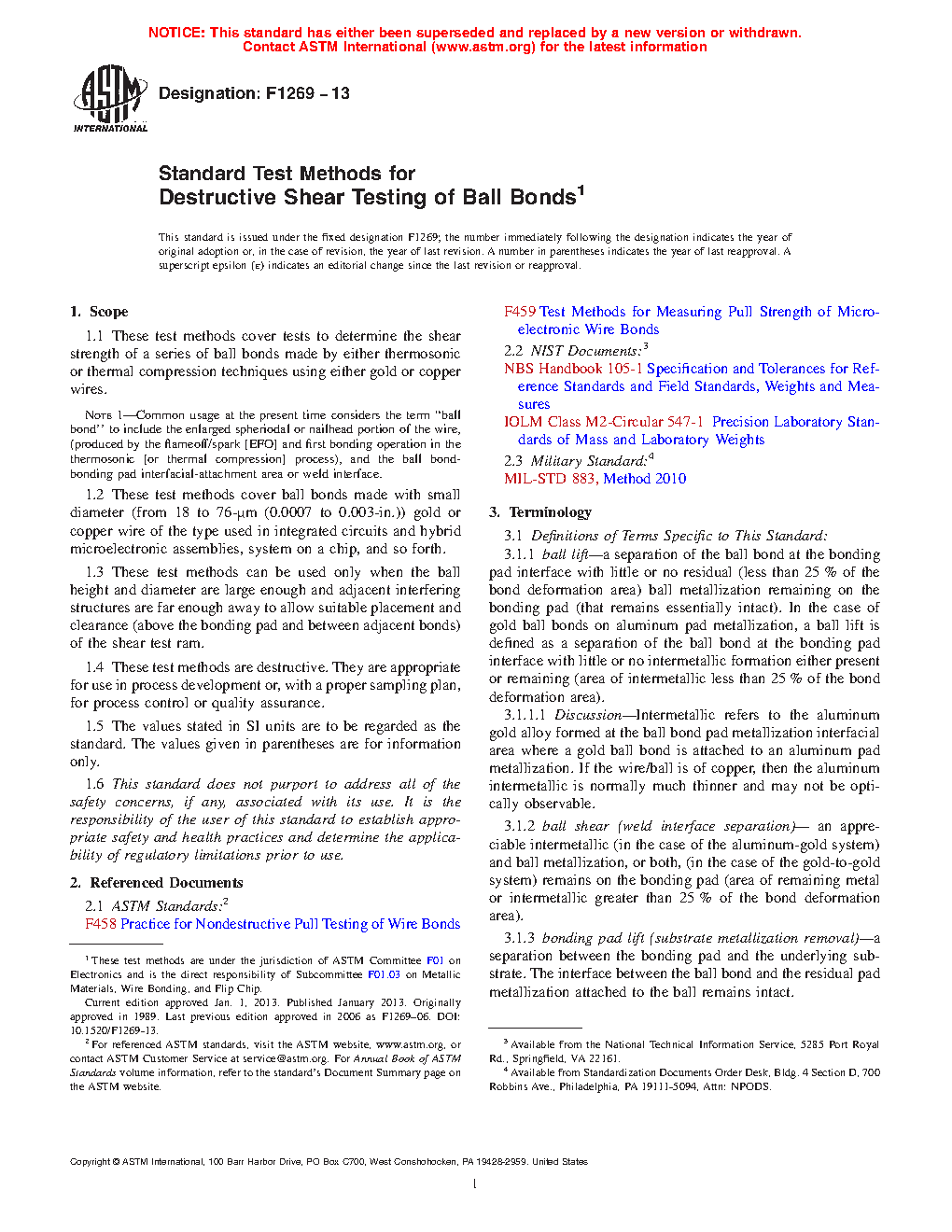 5.2 These test methods are appropriate for on-line use in process control, for process development, for purchase specifications, and for research in support of improved yield and reliability. Since the ball shearing method tests only the first bond in a microelectronic wire bond interconnection system, it must be used in a complementary fashion5 ,6 with the wire bond pull test.3