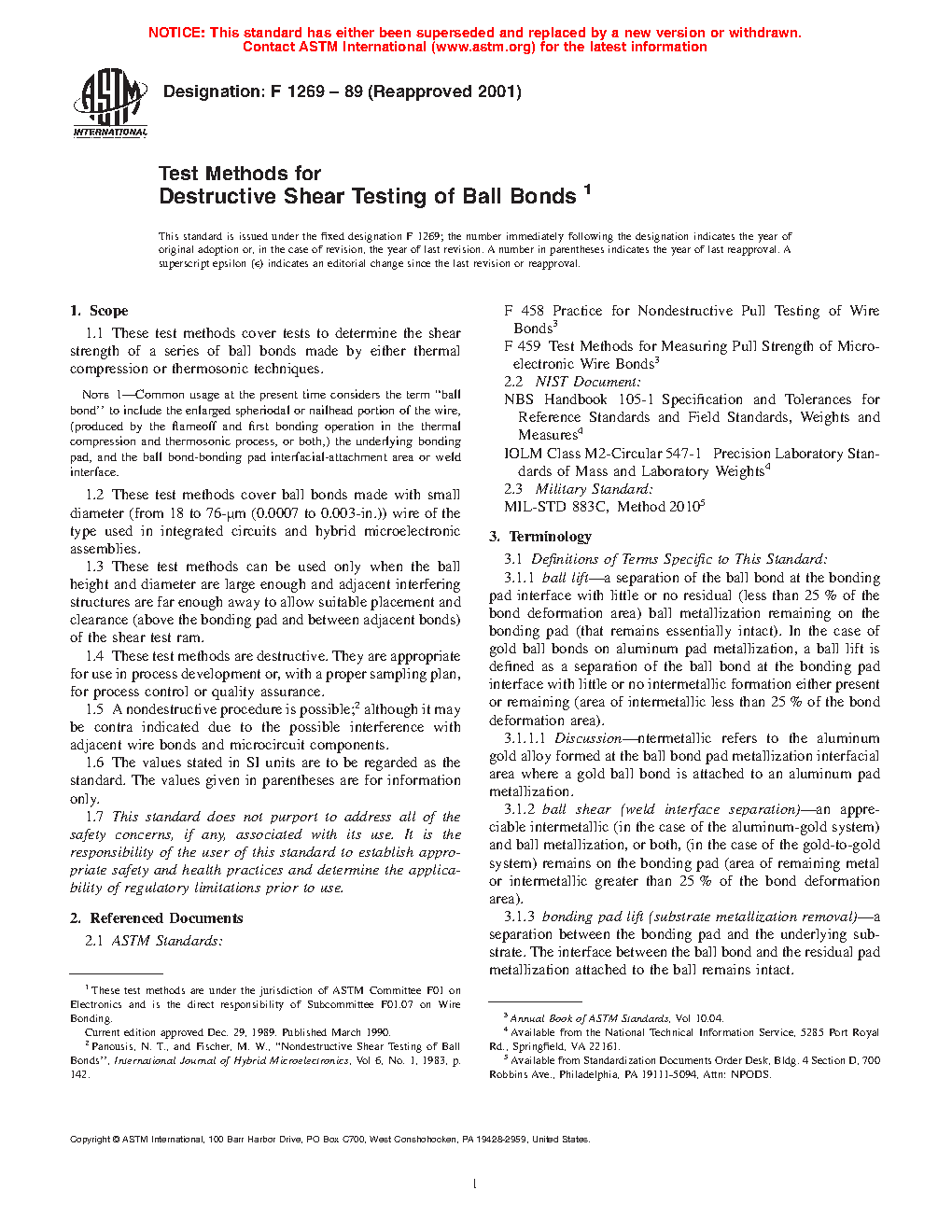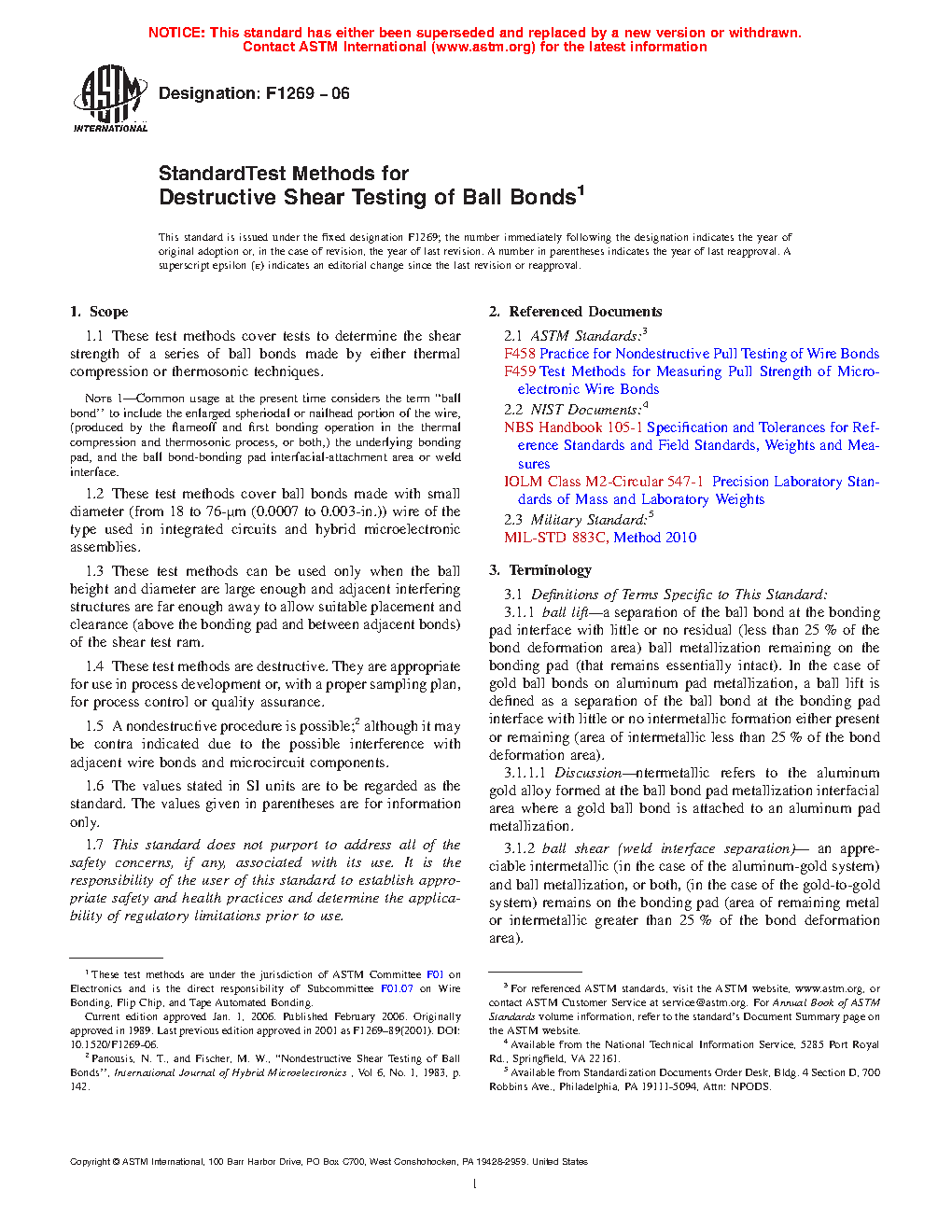 5.1 Failure of microelectronic devices is often due to the failure of an interconnection bond. The most common type of interconnection bond is the thermosonic gold or copper wire bond. A very important element of this interconnection is the first bond or ball bond. These test methods can assist in maintaining control of the process for making ball bonds. They can be used to distinguish between weak and nonadherent ball bonds, of both, and bonds that are acceptably strong.