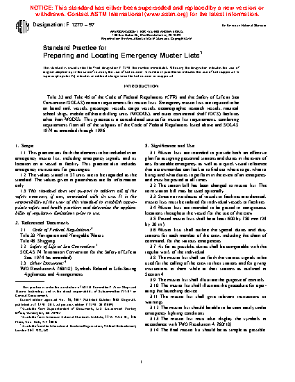 1.1 This practice sets forth the elements to be included in an emergency muster list, including emergency signals, and its location on a vessel or facility. This practice also includes emergency instructions for passengers.