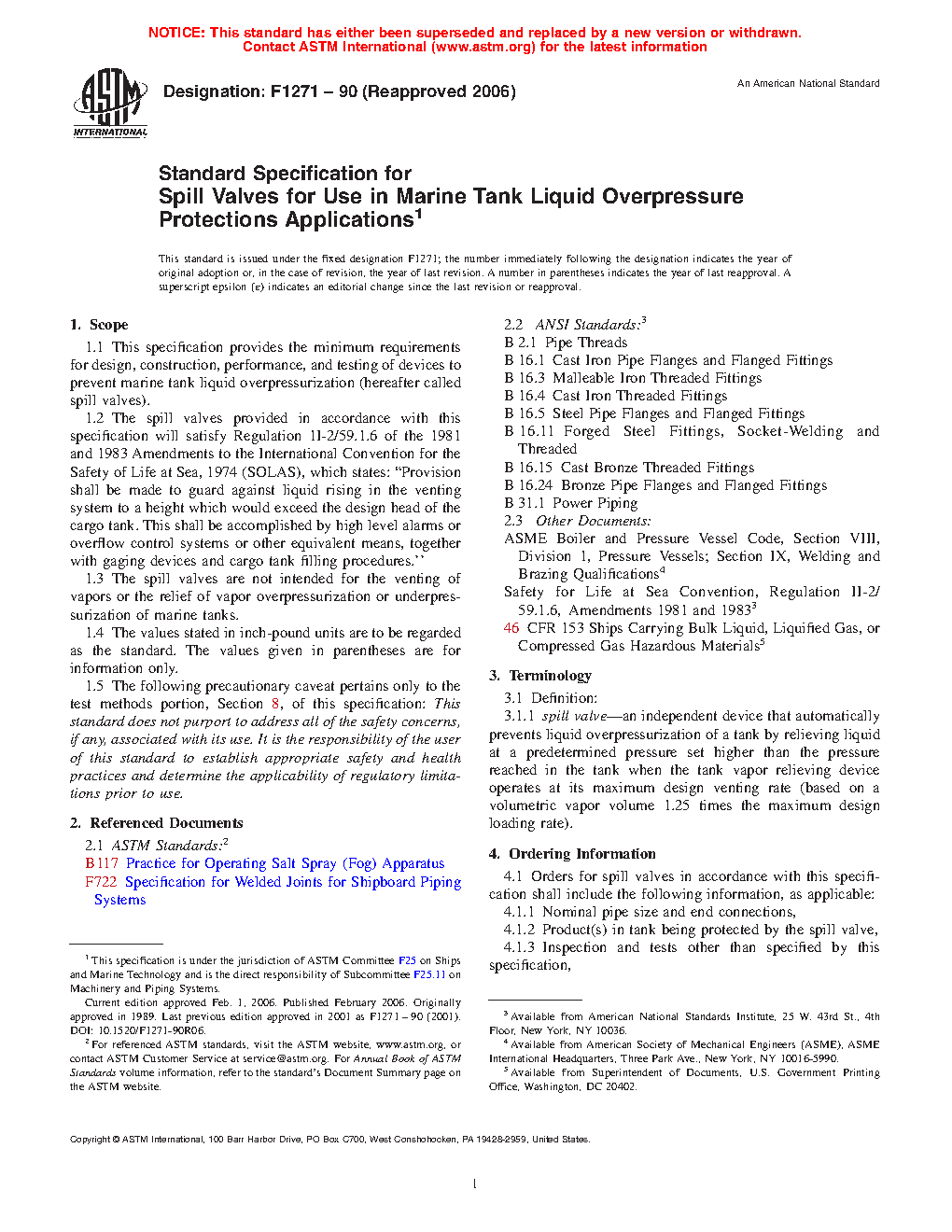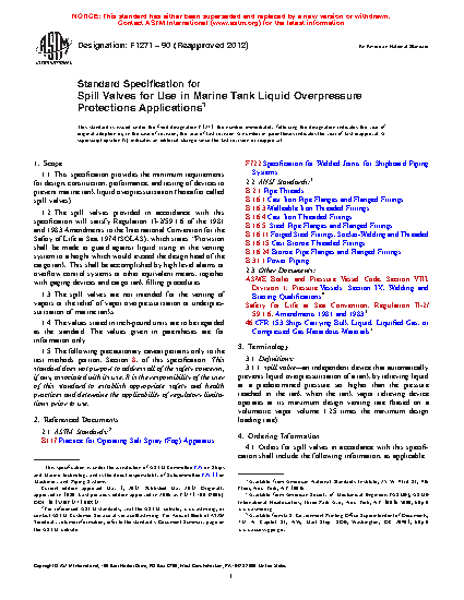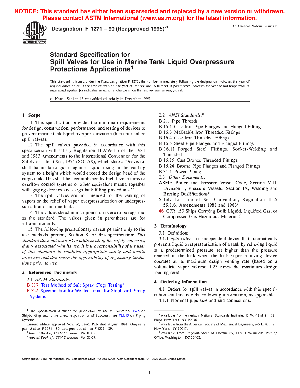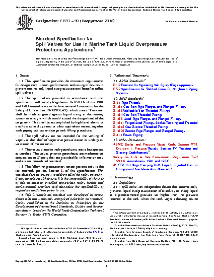 1.1 This specification provides the minimum requirements for design, construction, performance, and testing of devices to prevent marine tank liquid overpressurization (hereafter called spill valves).