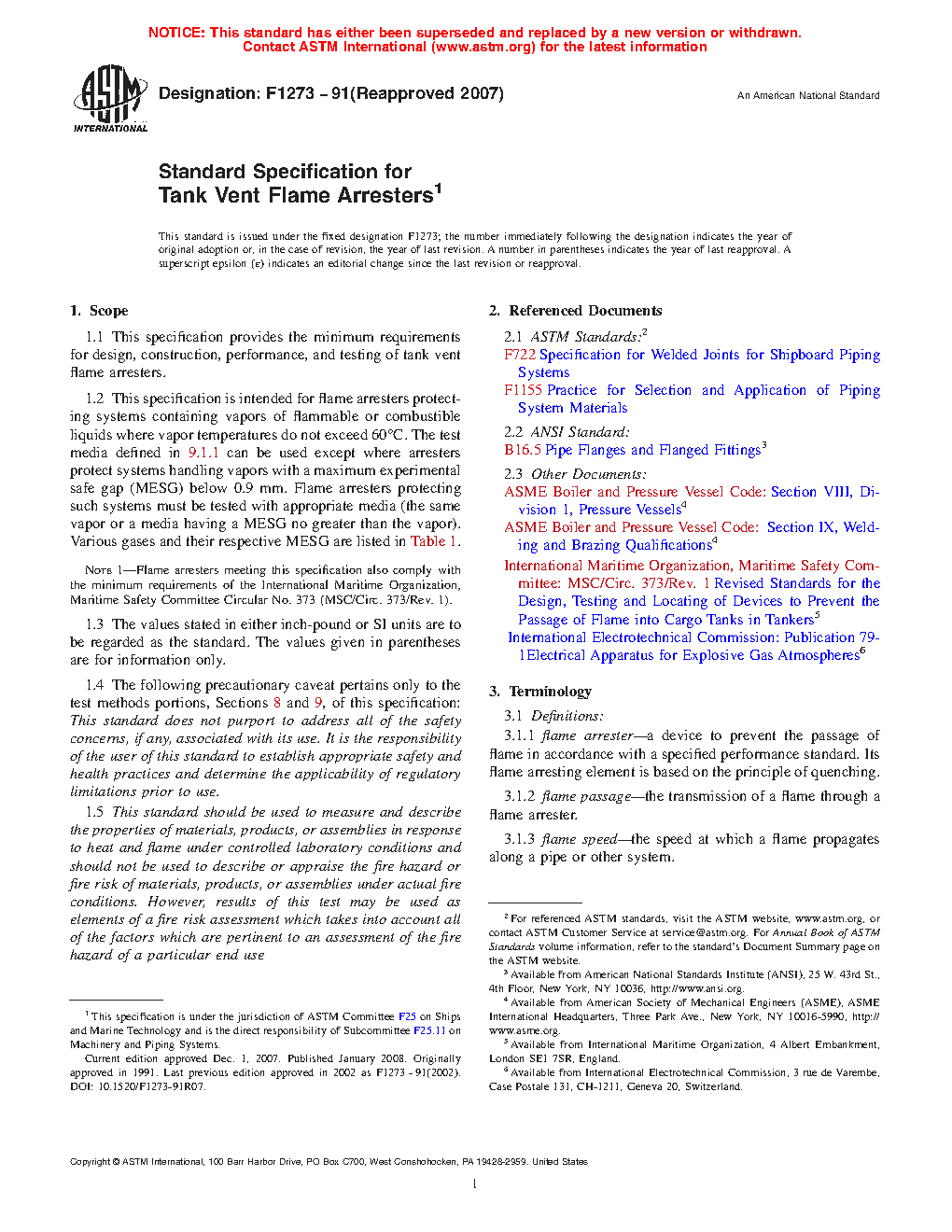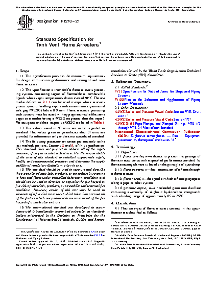 1.1 This specification provides the minimum requirements for design, construction, performance, and testing of tank vent flame arresters.