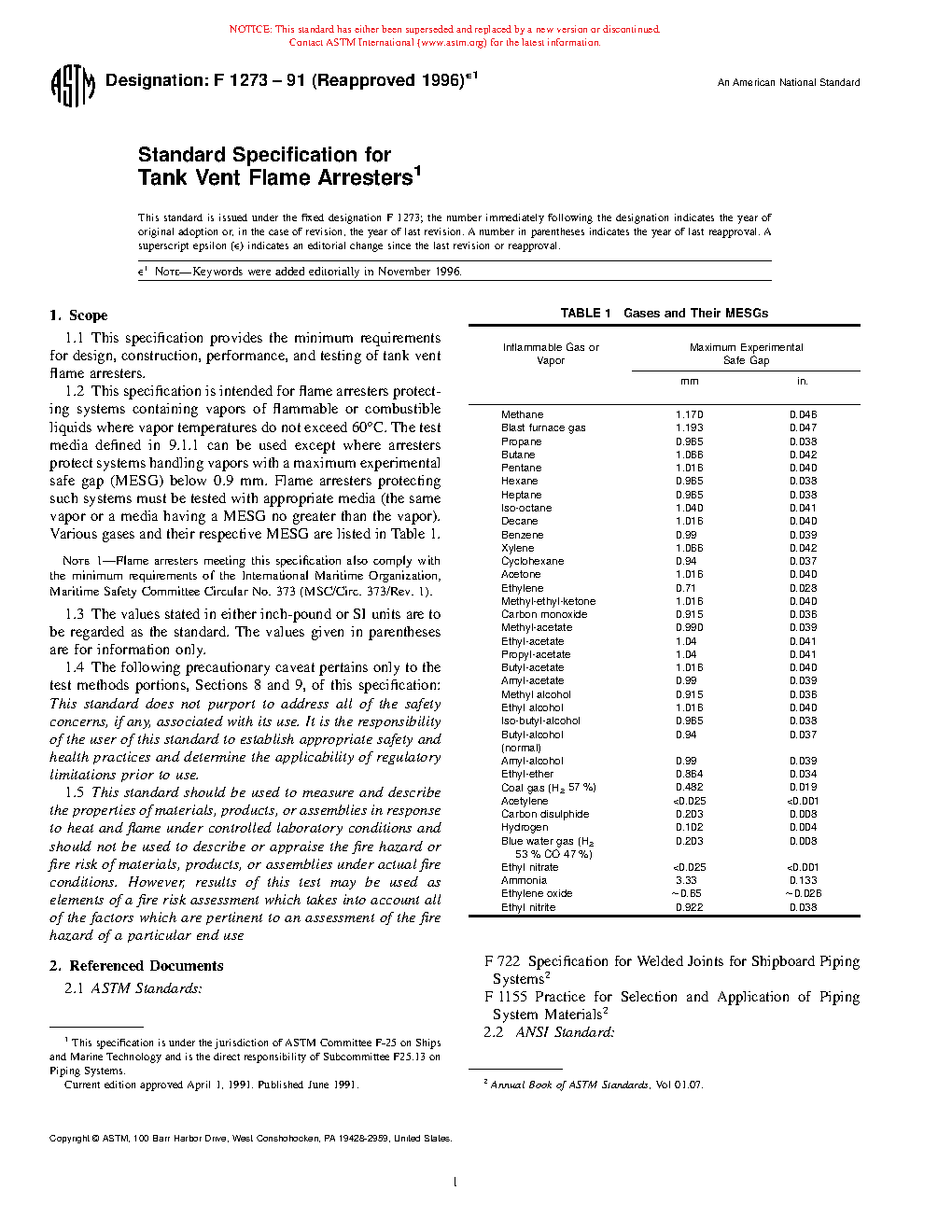 1.2 This specification is intended for flame arresters protecting systems containing vapors of flammable or combustible liquids where vapor temperatures do not exceed 60°C. The test media defined in 9.1.1 can be used except where arresters protect systems handling vapors with a maximum experimental safe gap (MESG) below 0.9 mm. Flame arresters protecting such systems must be tested with appropriate media (the same vapor or a media having a MESG no greater than the vapor). Various gases and their respective MESG are listed in Table 1.