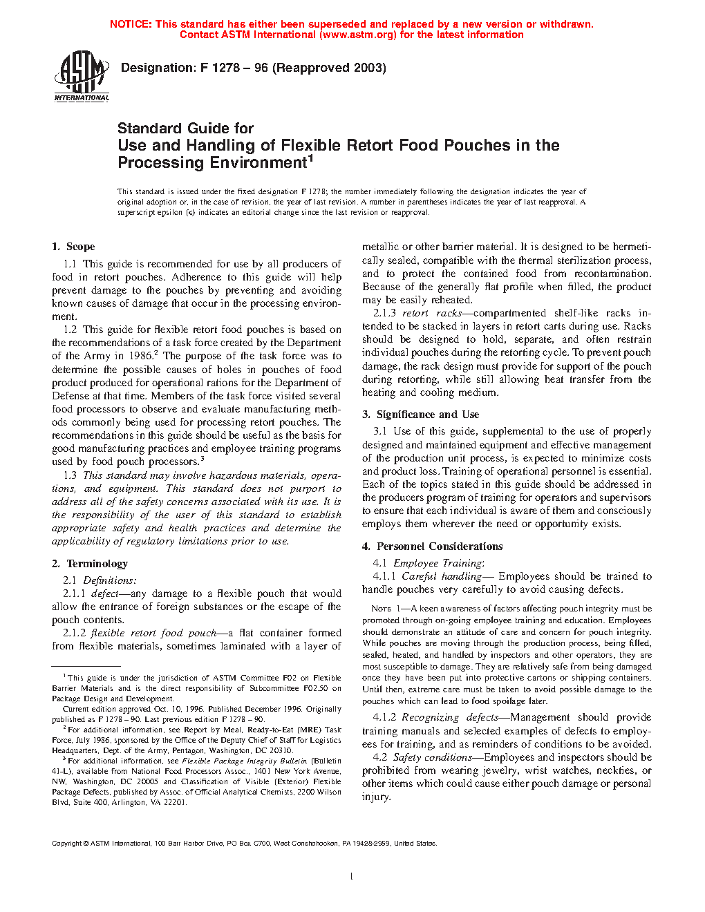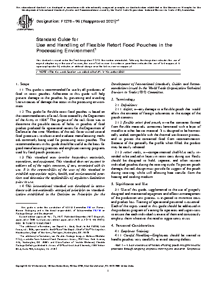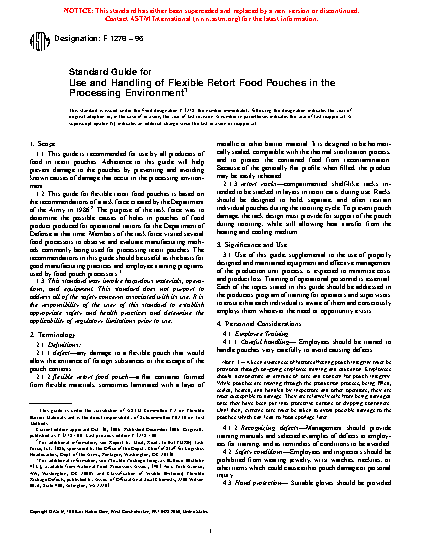 1.2 This guide for flexible retort food pouches is based on the recommendations of a task force created by the Department of the Army in 1986.2 The purpose of the task force was to determine the possible causes of holes in pouches of food product produced for operational rations for the Department of Defense at that time. Members of the task force visited several food processors to observe and evaluate manufacturing methods commonly being used for processing retort pouches. The recommendations in this guide should be useful as the basis for good manufacturing practices and employee training programs used by food pouch processors.3