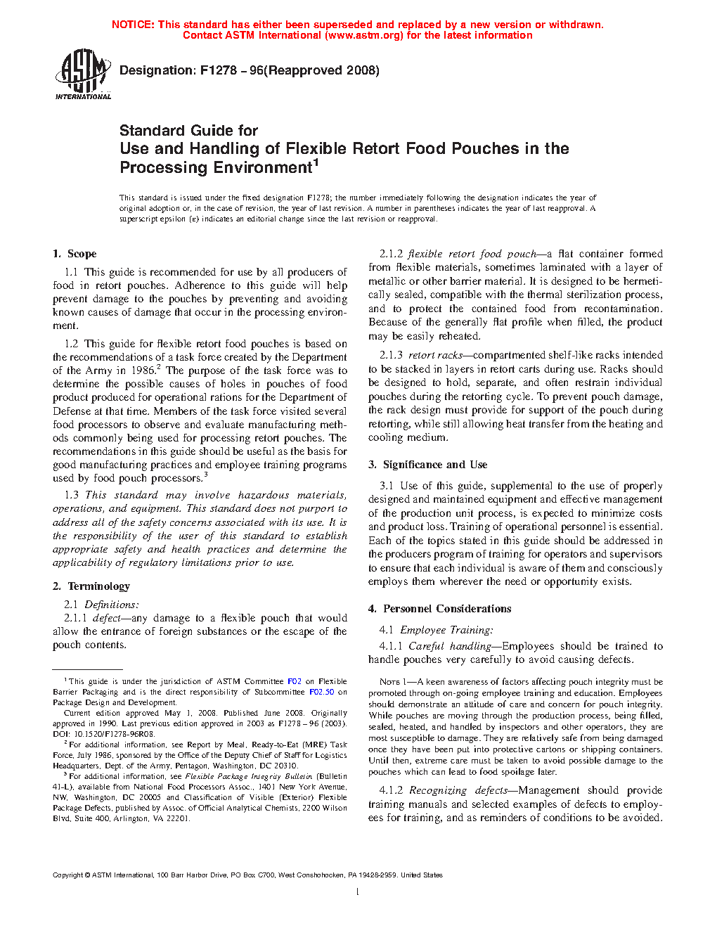 1.1 This guide is recommended for use by all producers of food in retort pouches. Adherence to this guide will help prevent damage to the pouches by preventing and avoiding known causes of damage that occur in the processing environment.