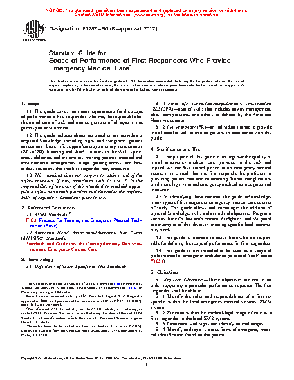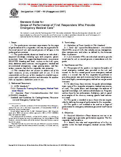 1.1 This guide covers minimum requirements for the scope of performance of first responders who may be responsible for the initial care of sick and injured persons of all ages in the prehospital environment.