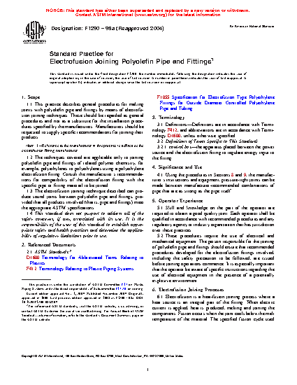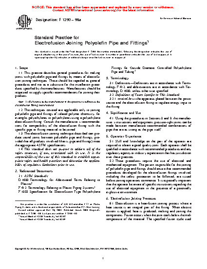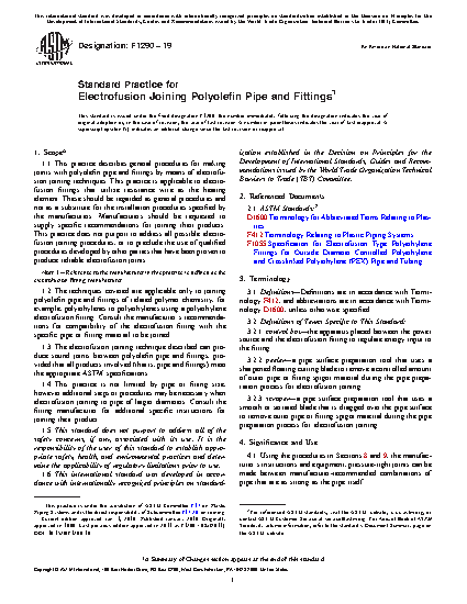 1.3 The electrofusion joining technique described can produce sound joints between polyolefin pipe and fittings, provided that all products involved (that is, pipe and fittings) meet the appropriate ASTM specifications.