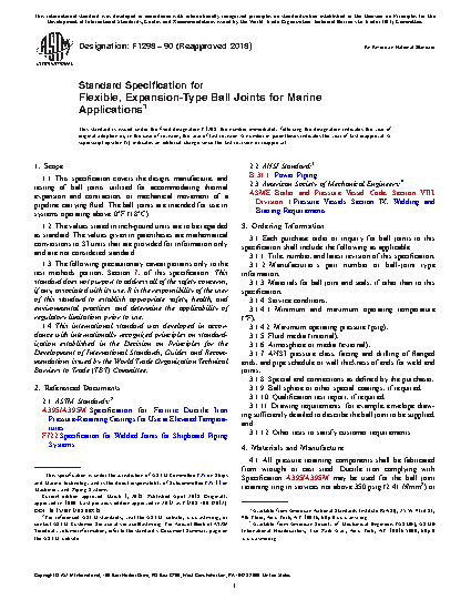 This specification covers the design, manufacture, and testing of ball joints utilized for accommodating thermal expansion and contraction, or mechanical movement of a pipeline carrying fluid. Ball joints shall be designed to conform to the requirements prescribed. Flex cycle test, thermal cycling test, and hydrostatic test shall be performed to meet the requirements prescribed.