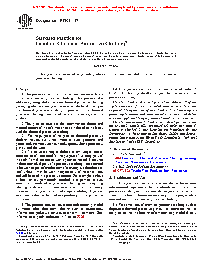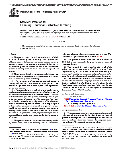 1.1 This practice covers the informational content of labels in or on chemical protective clothing. This practice also addresses putting label content on chemical protective clothing packaging when it is not practical to attach the label directly to the chemical protective clothing or print it on the chemical protective clothing item based on the size or type of the product.