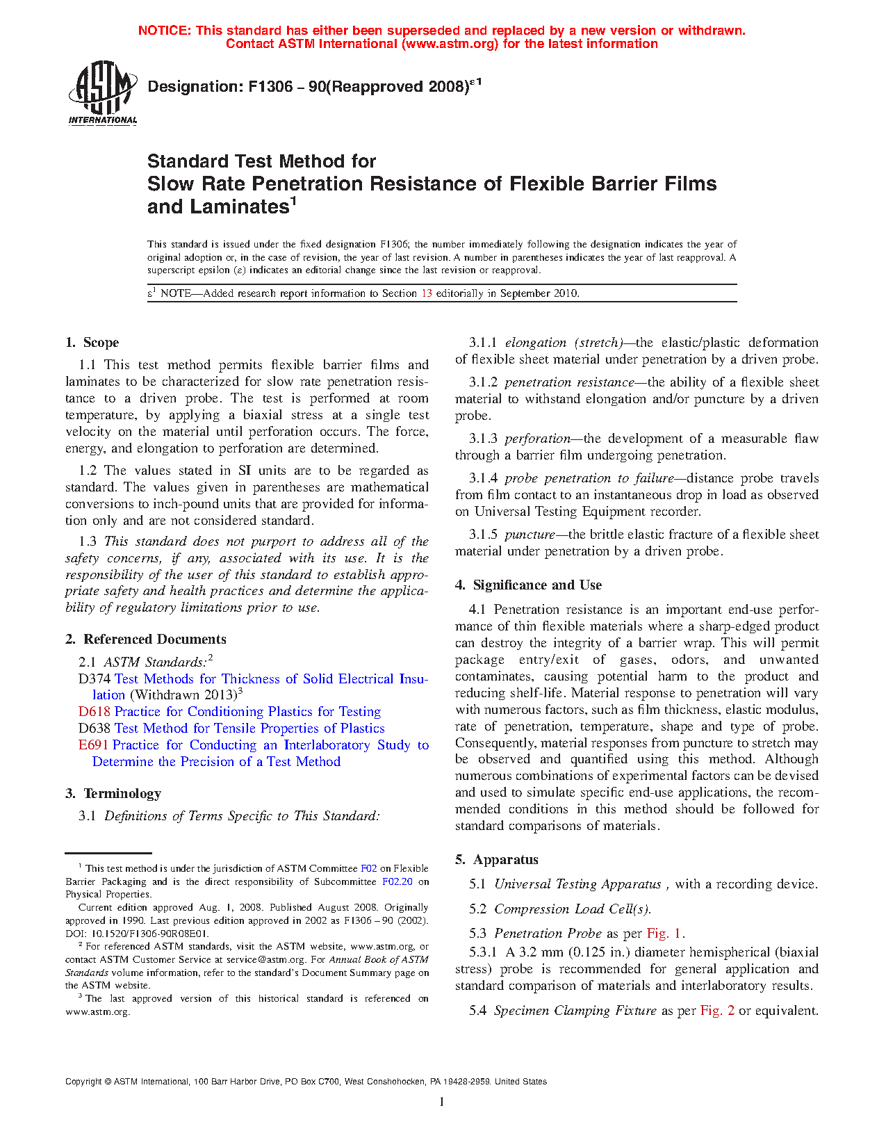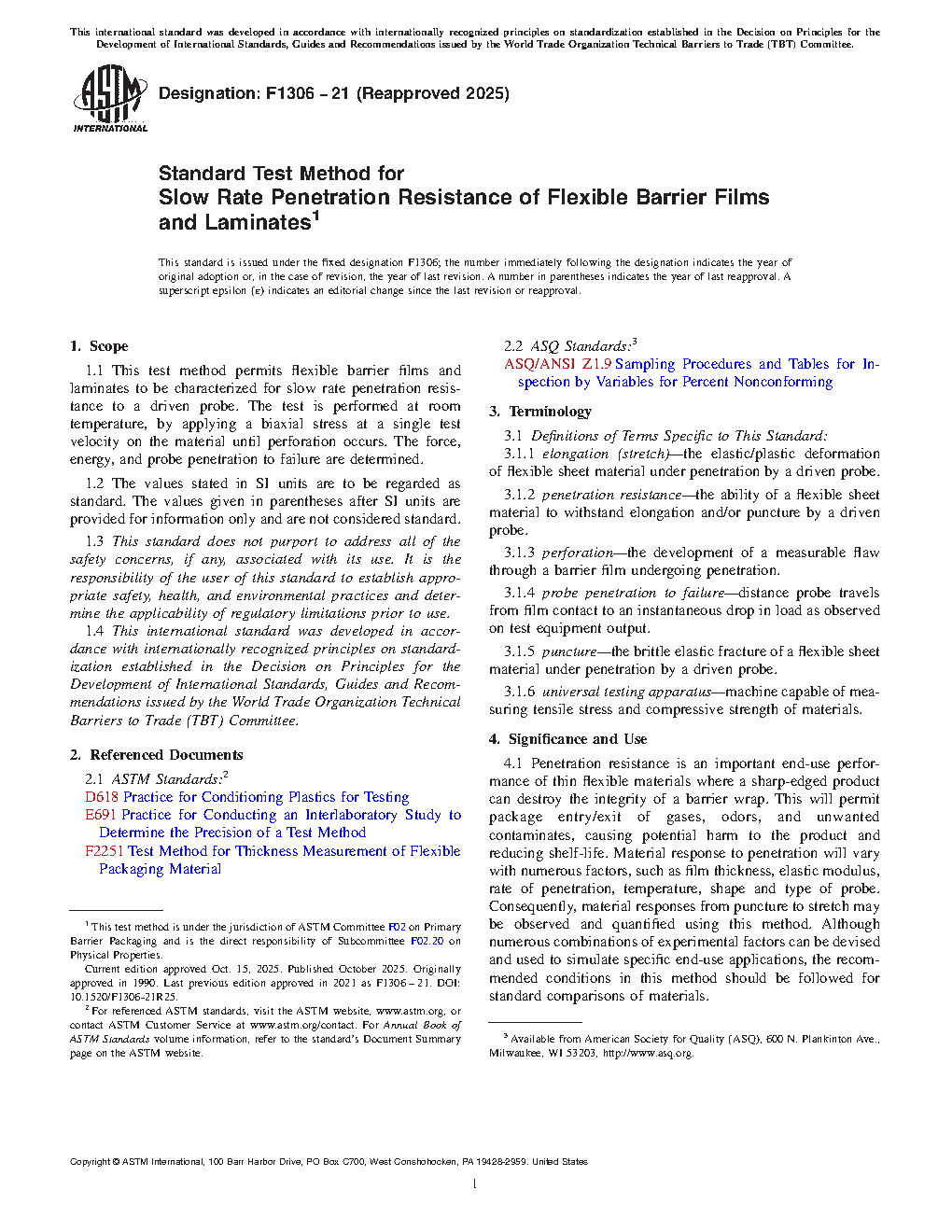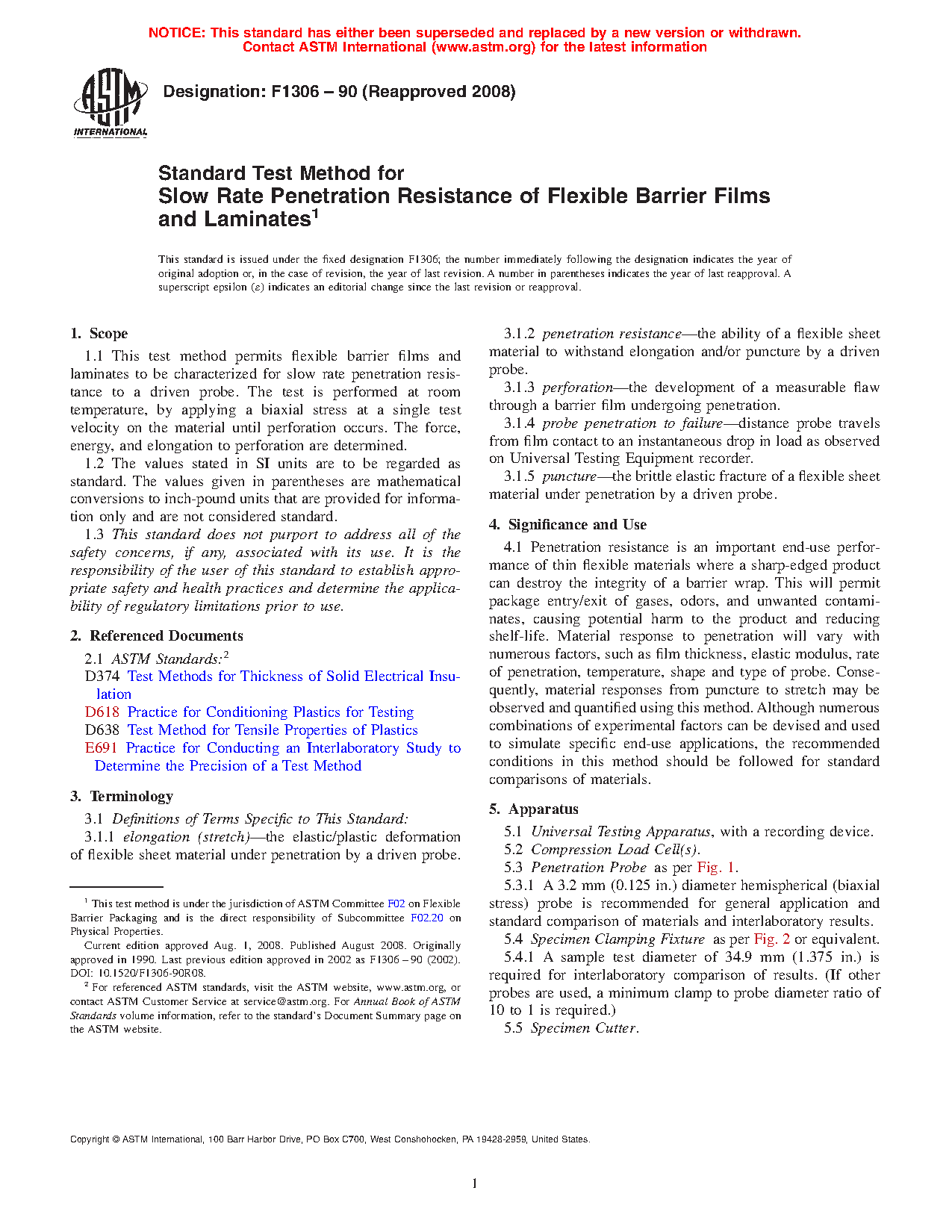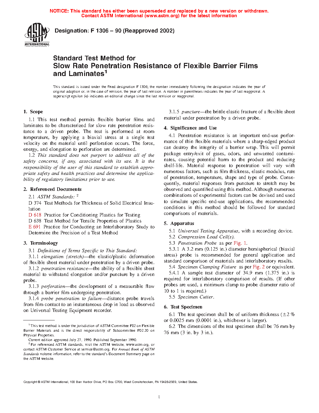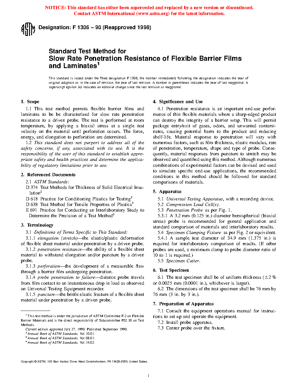 1.1 This test method permits flexible barrier films and laminates to be characterized for slow rate penetration resistance to a driven probe. The test is performed at room temperature, by applying a biaxial stress at a single test velocity on the material until perforation occurs. The force, energy, and probe penetration to failure are determined.