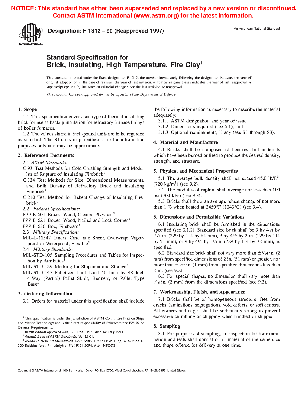 This specification covers thermal insulating bricks made from fire clay that are used as backup insulation for refractory furnace linings of boiler furnaces. The bricks shall be composed of heat-resistant materials that have been burned or fired to produce the desired density, strength, and structure. Representative bricks shall be tested, and shall conform accordingly to specified values of bulk density, modulus of rupture, and reheat change.