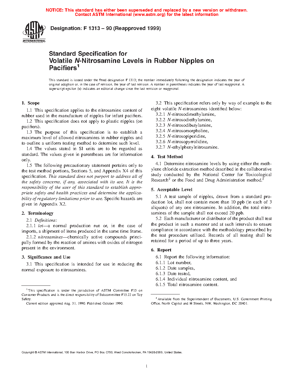 1.3 The purpose of this specification is to establish a maximum level of allowed nitrosamines in rubber nipples and to outline a uniform testing method to determine such level.