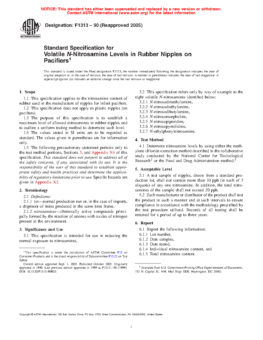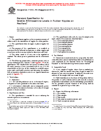 1.3 The purpose of this specification is to establish a maximum level of allowed nitrosamines in rubber nipples and to outline a uniform testing method to determine such level.