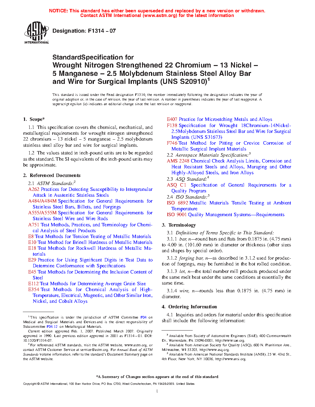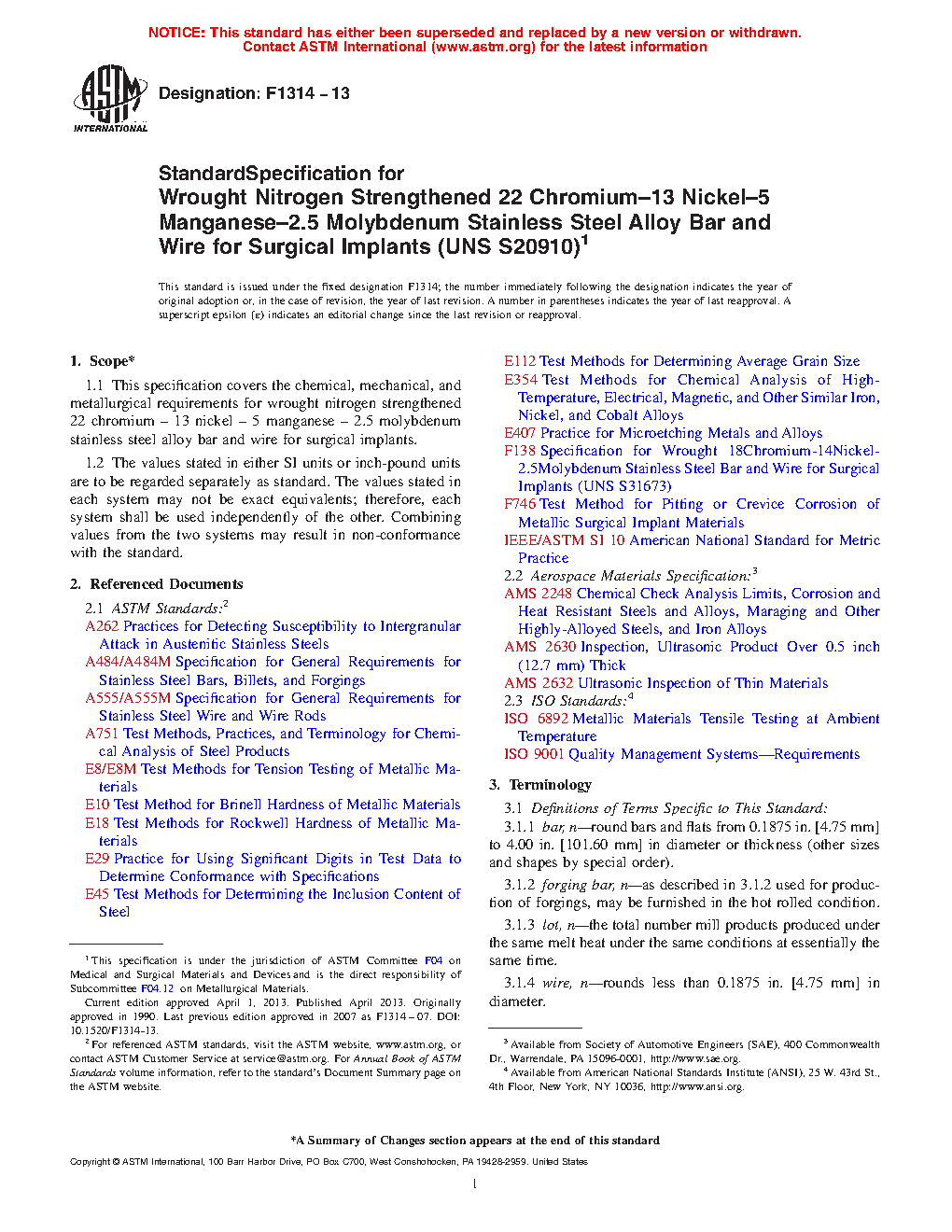 Standard Specification for Wrought Nitrogen Strengthened 22 Chromium–13 Nickel–5 Manganese–2.5 Molybdenum Stainless Steel Alloy Bar and Wire for Surgical Implants (UNS S20910)