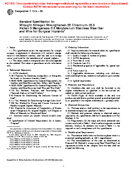 1.1 This specification covers the chemical, mechanical, and metallurgical requirements for wrought nitrogen strengthened 22 chromium – 13 nickel – 5 manganese – 2.5 molybdenum stainless steel alloy bar and wire for surgical implants.