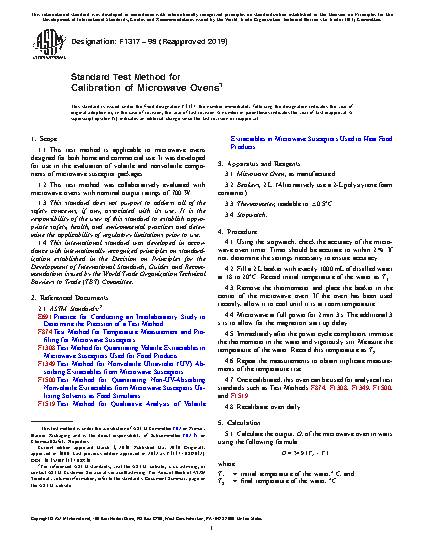 This test method covers the apparatus required, and standard procedures and calculations involved in the calibration of microwave ovens designed for both home and commercial use. It was developed for use in the evaluation of volatile and nonvolatile components of microwave susceptor packages. There are, however, no recognized standards by which to estimate bias of this test method.