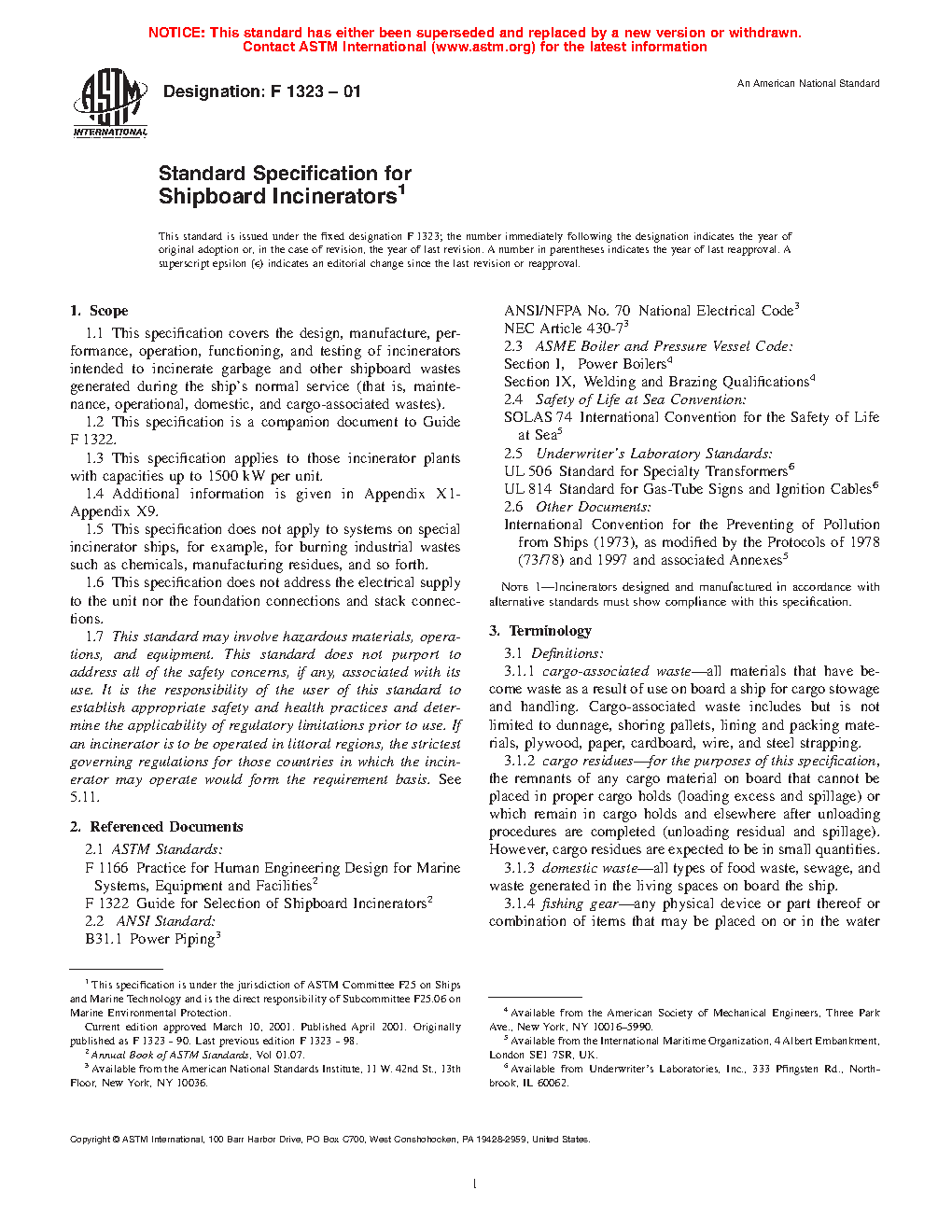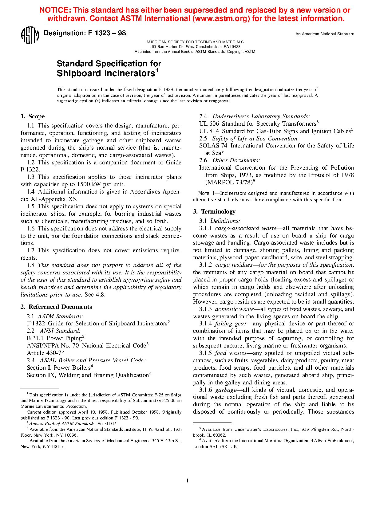 1.1 This specification covers the design, manufacture, performance, operation, functioning, and testing of incinerators intended to incinerate garbage and other shipboard wastes generated during the ship’s normal service (that is, maintenance, operational, domestic, and cargo-associated wastes).