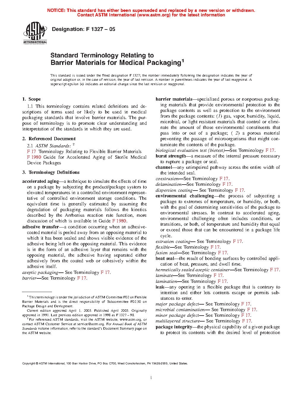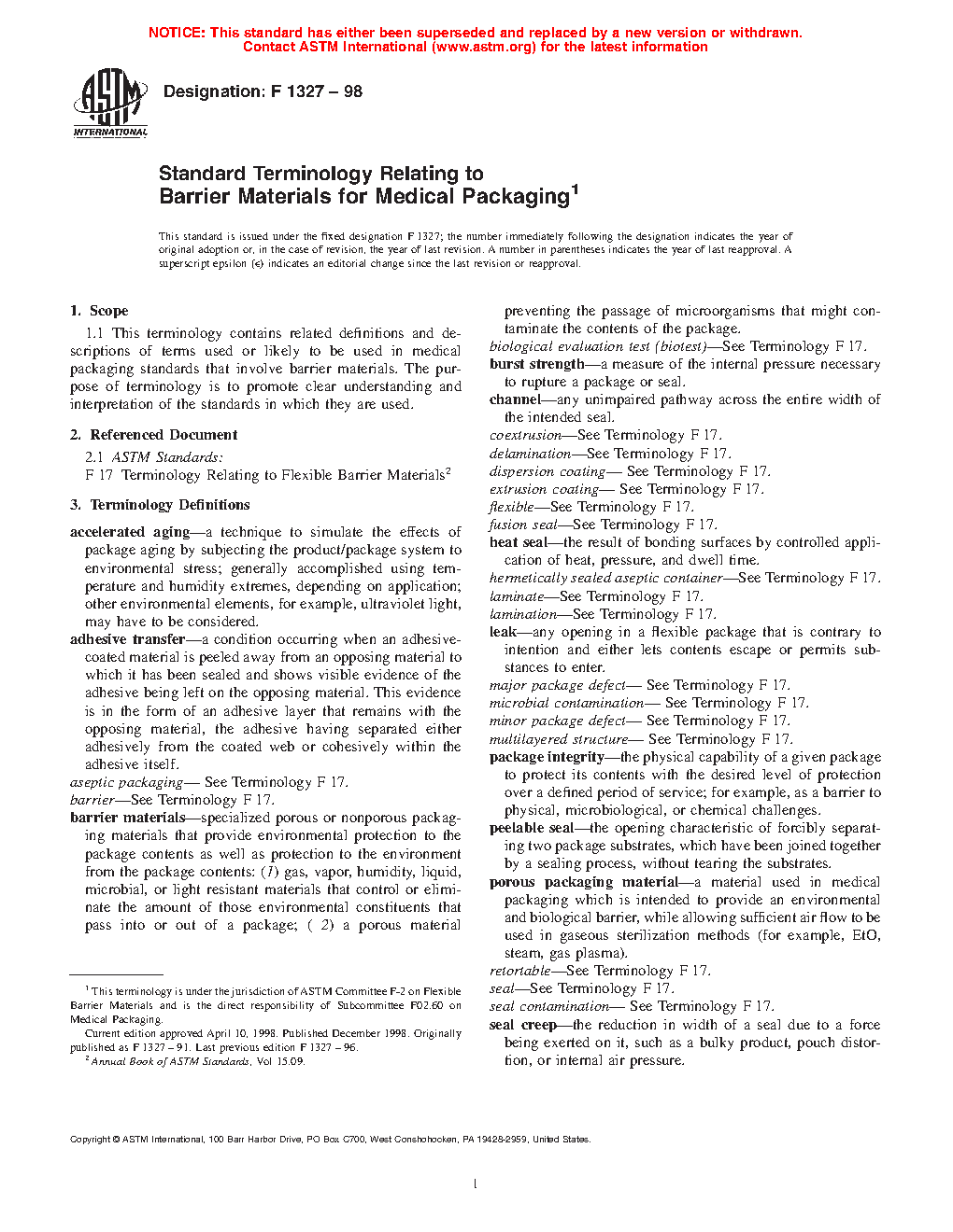 1.1 This terminology contains related definitions and descriptions of terms used or likely to be used in medical packaging standards that involve barrier materials. The purpose of terminology is to promote clear understanding and interpretation of the standards in which they are used.
