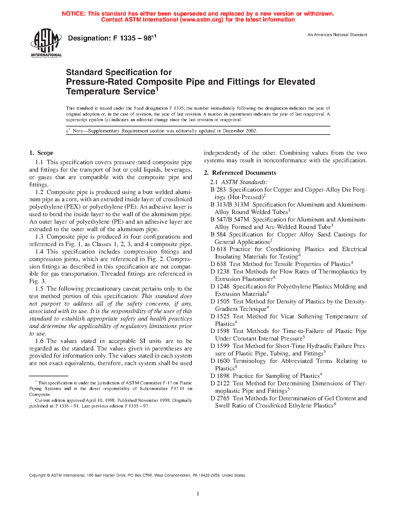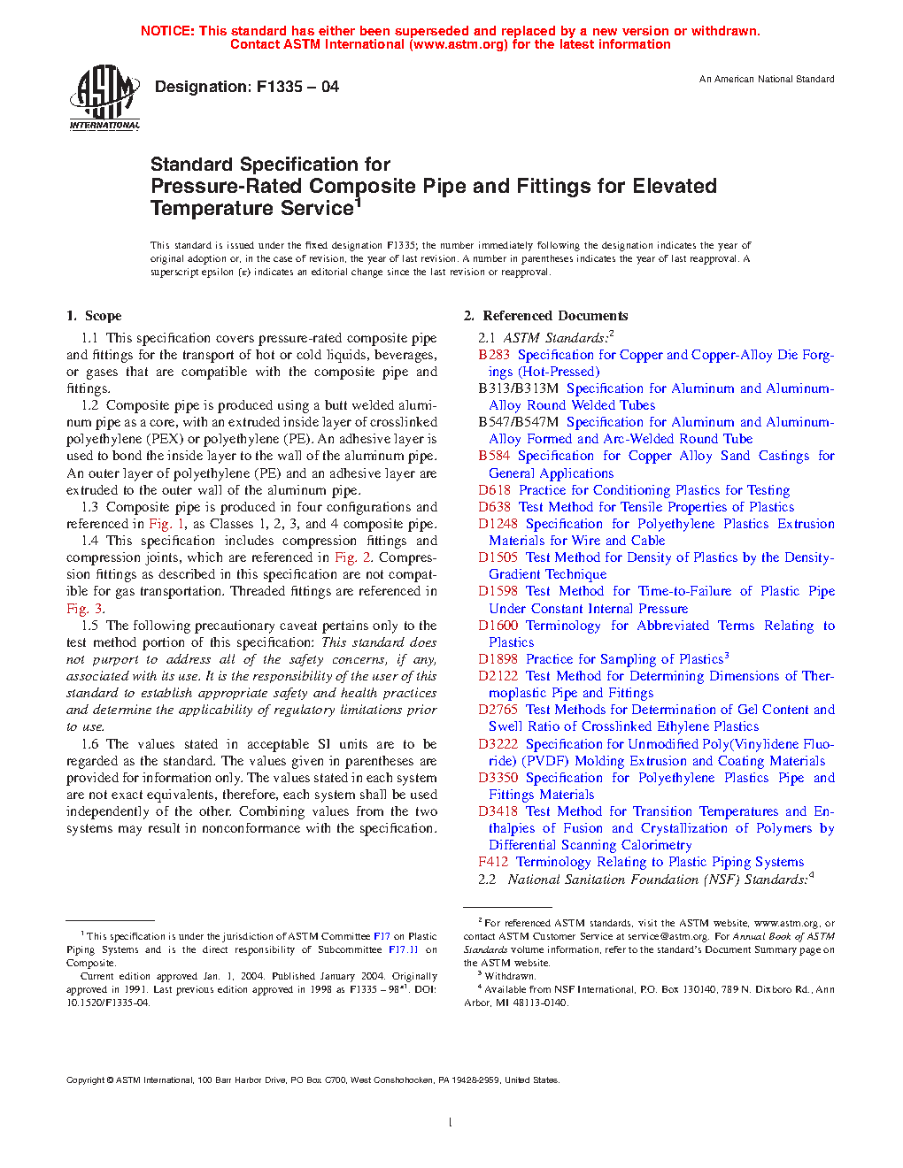 1.1 This specification covers pressure-rated composite pipe and fittings for the transport of hot or cold liquids, beverages, or gases that are compatible with the composite pipe and fittings.