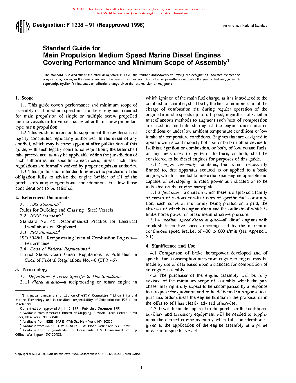 1.1 This guide covers performance and minimum scope of assembly of all medium speed marine diesel engines intended for main propulsion of single or multiple screw propelled marine vessels or for vessels using other than screw propeller-type main propulsion.