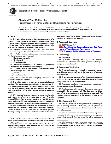 1.1 This test method determines the puncture resistance of a protective clothing material specimen by measuring the force required to cause a pointed puncture probe to penetrate through the specimen. This test method describes three protocols that may be used: Method A, Method B, and Method C.