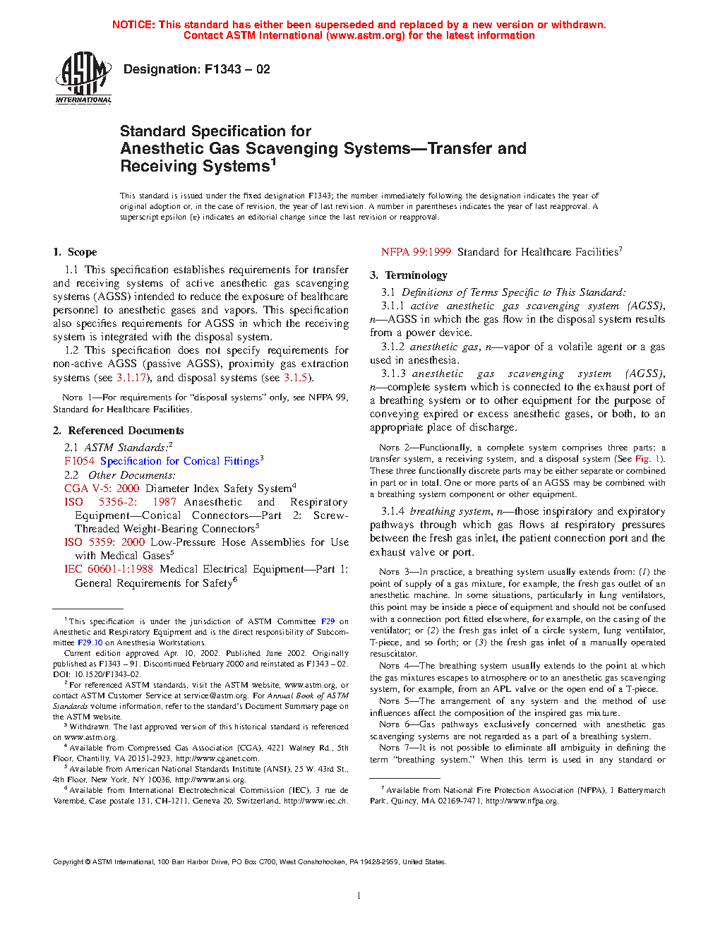 1.1 This specification establishes requirements for transfer and receiving systems of active anesthetic gas scavenging systems (AGSS) intended to reduce the exposure of healthcare personnel to anesthetic gases and vapors. This specification also specifies requirements for AGSS in which the receiving system is integrated with the disposal system.