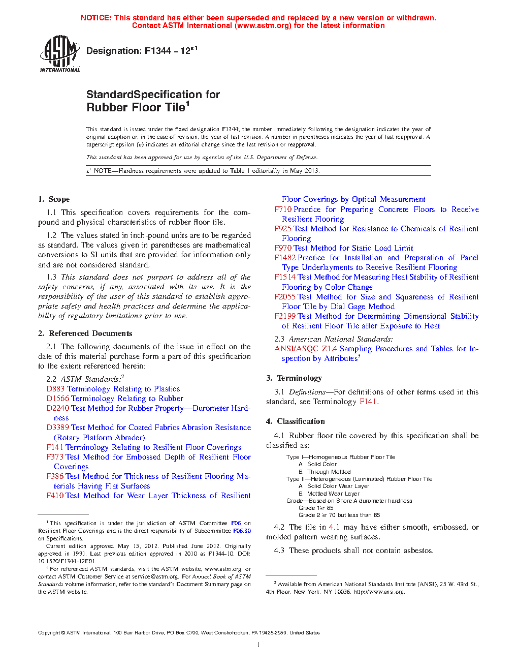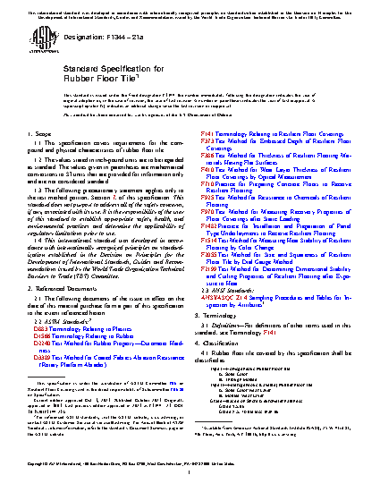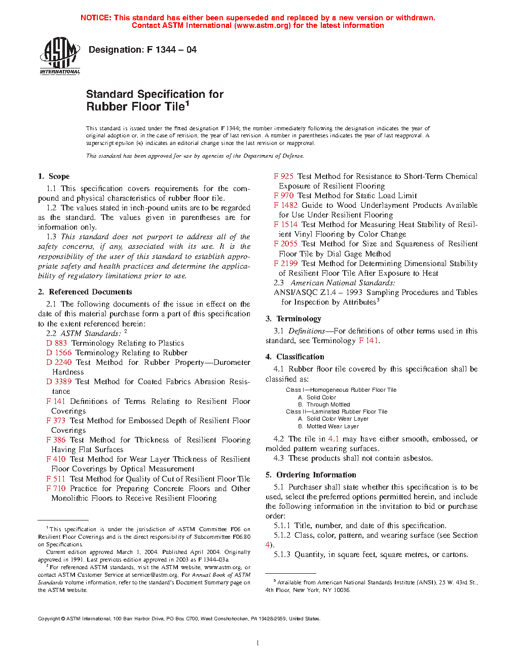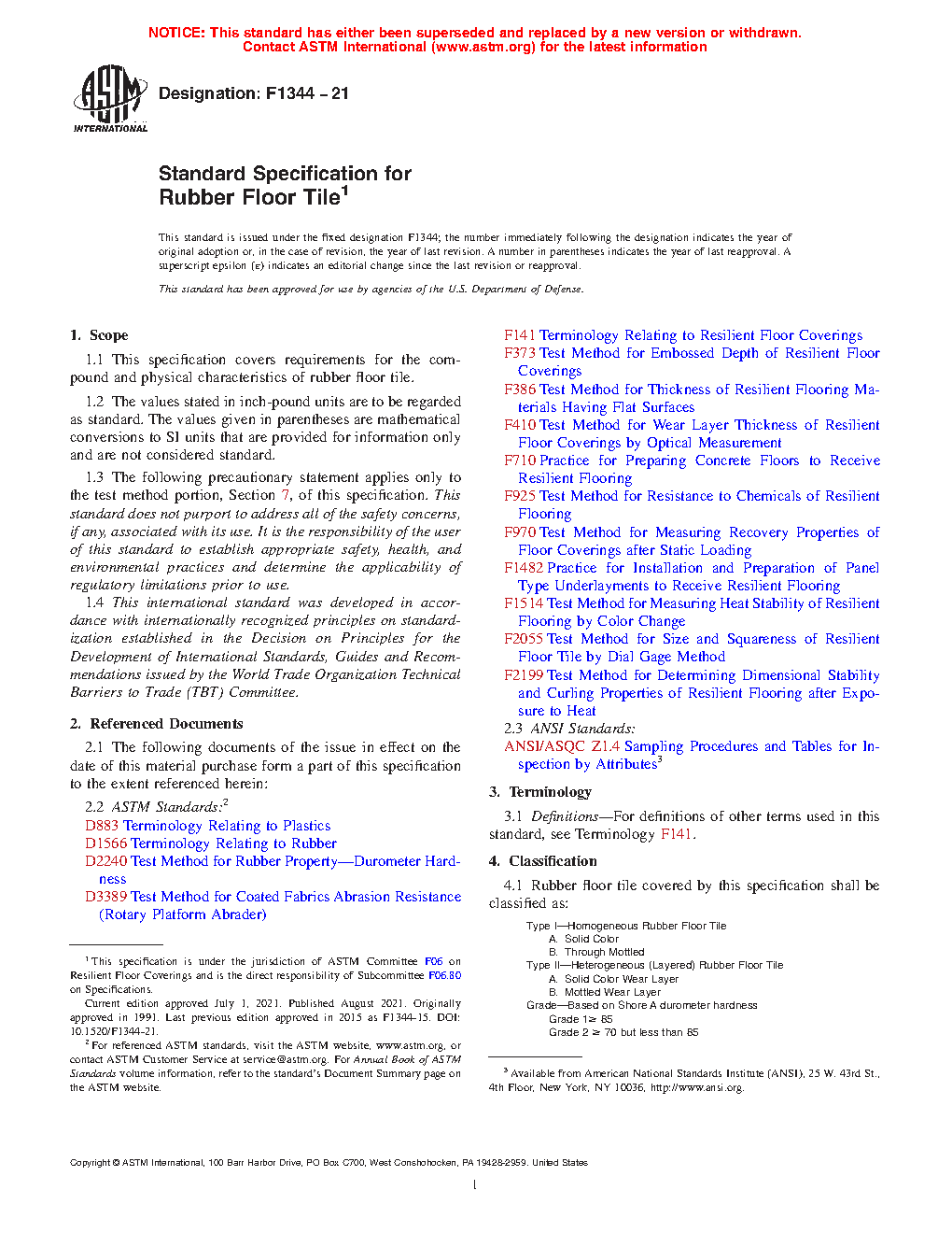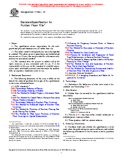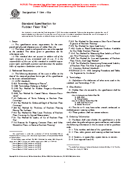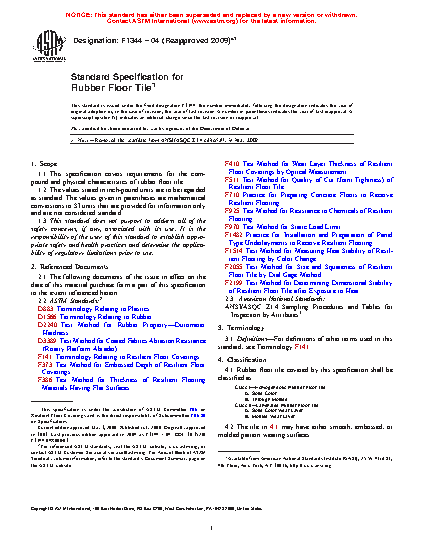 This specification covers requirements for the compound and physical characteristics of rubber floor tile. The polymeric binder of the rubber floor tile shall have been vulcanized such that it becomes thermoset. The rubber floor tile made from this compound shall be resistant to neutral pH cleaners. For homogeneous rubber floor tile, the surface coloring or mottling shall be uniform throughout the entire thickness of the rubber floor tile. For layered rubber floor tile, the surface color or mottling need not extend through the entire thickness of the rubber floor tile, but must extend throughout the entire thickness of the wear layer. The material shall be tested for heat resistance, abrasion resistance, dimensional stability, and light resistance.