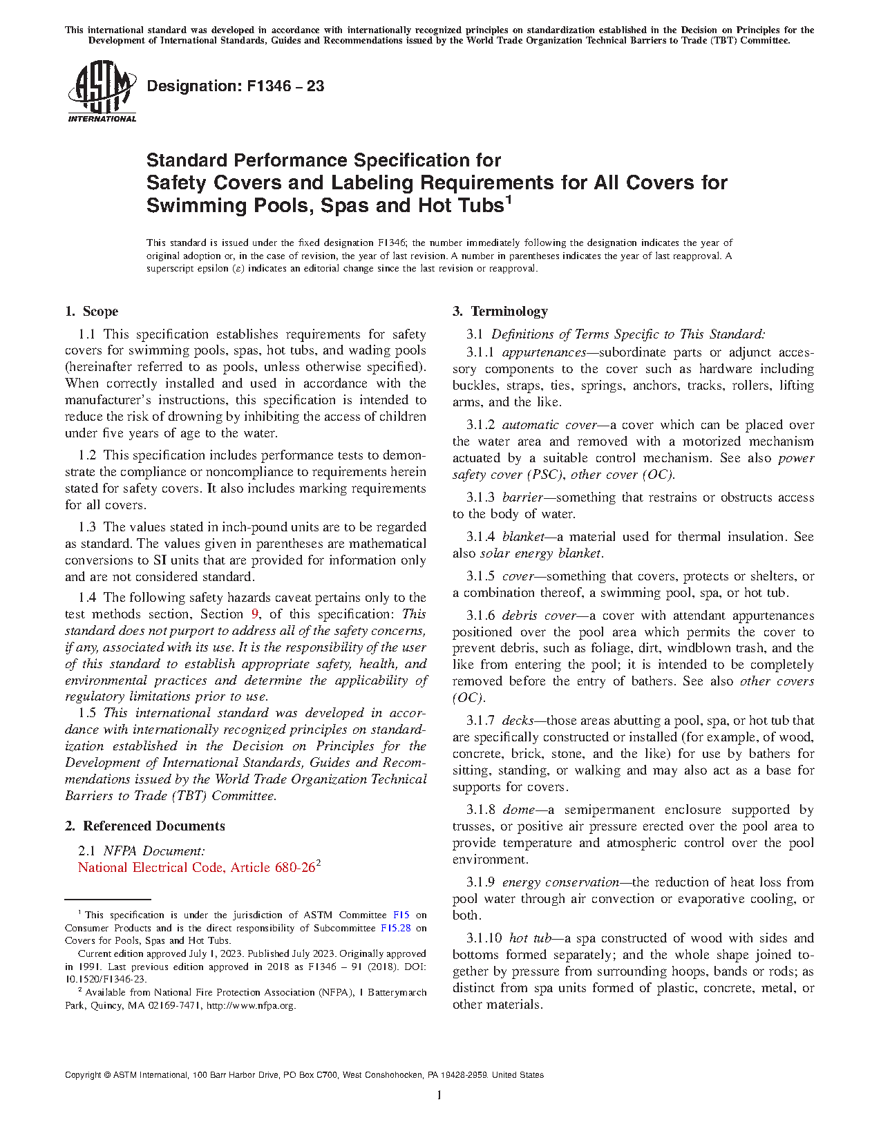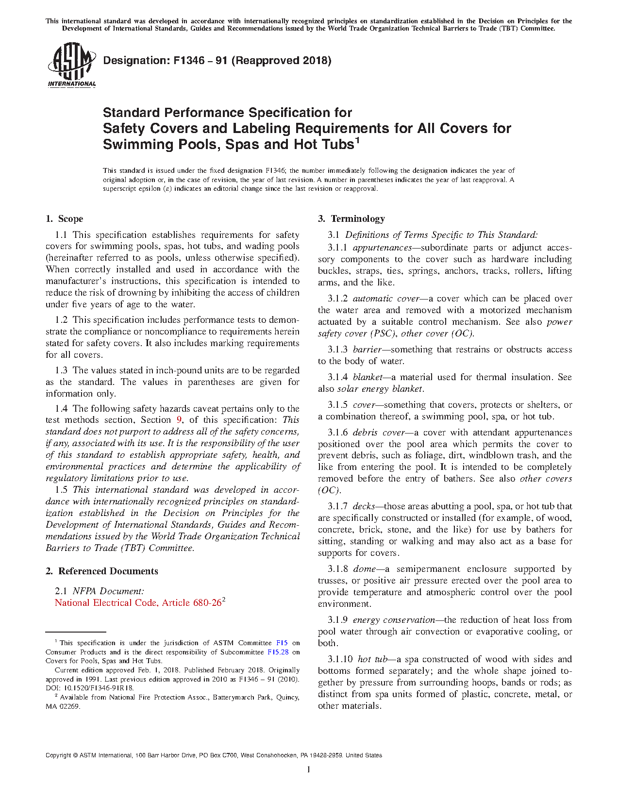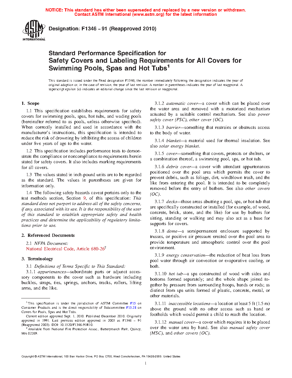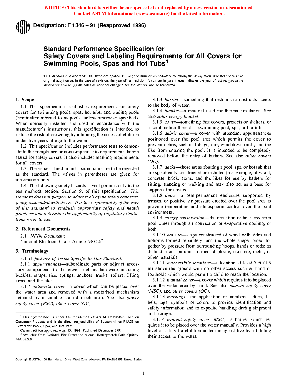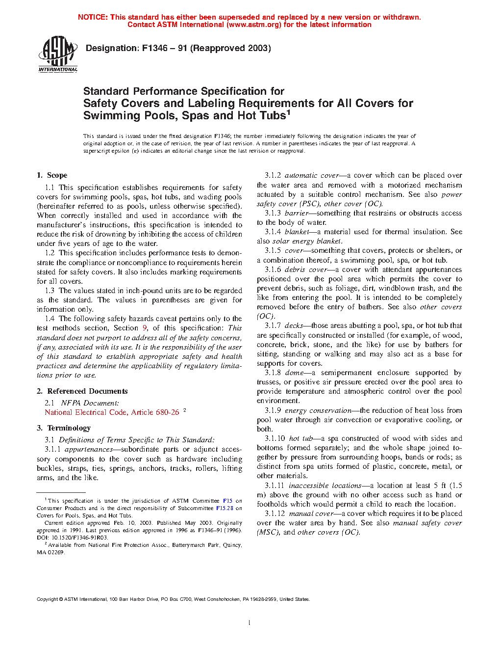 1.1 This specification establishes requirements for safety covers for swimming pools, spas, hot tubs, and wading pools (hereinafter referred to as pools, unless otherwise specified). When correctly installed and used in accordance with the manufacturer's instructions, this specification is intended to reduce the risk of drowning by inhibiting the access of children under five years of age to the water.