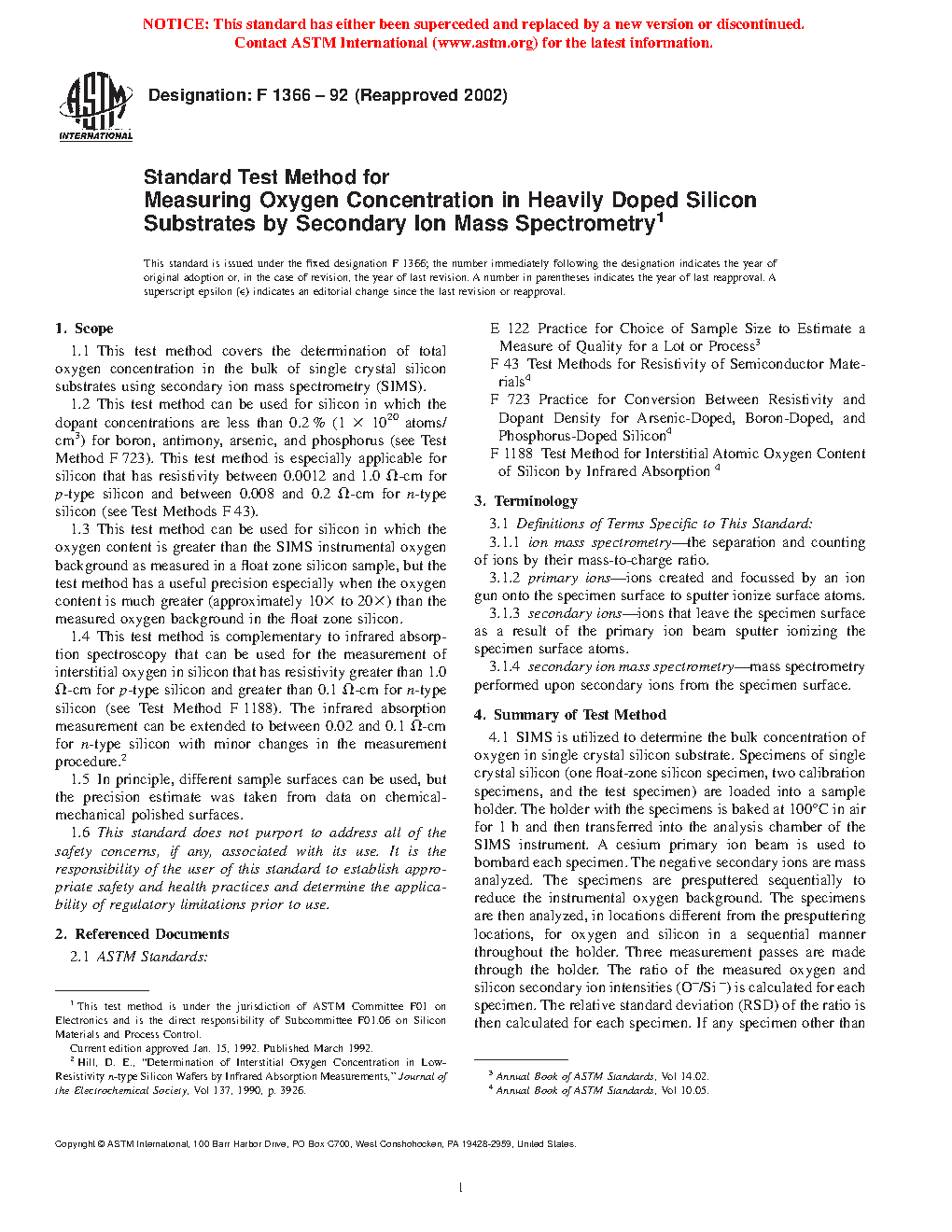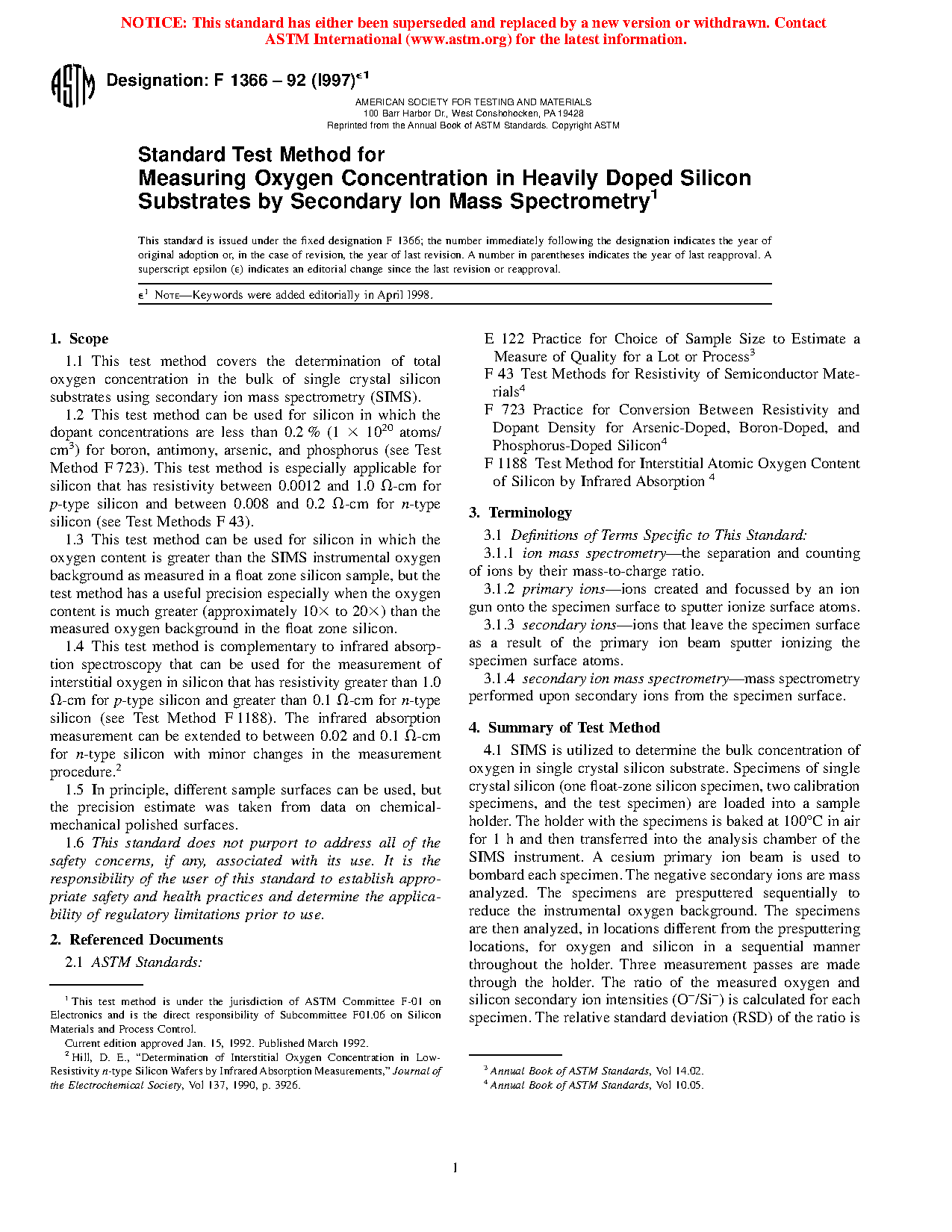 1.3 This test method can be used for silicon in which the oxygen content is greater than the SIMS instrumental oxygen background as measured in a float zone silicon sample, but the test method has a useful precision especially when the oxygen content is much greater (approximately 10x to 20x) than the measured oxygen background in the float zone silicon.
