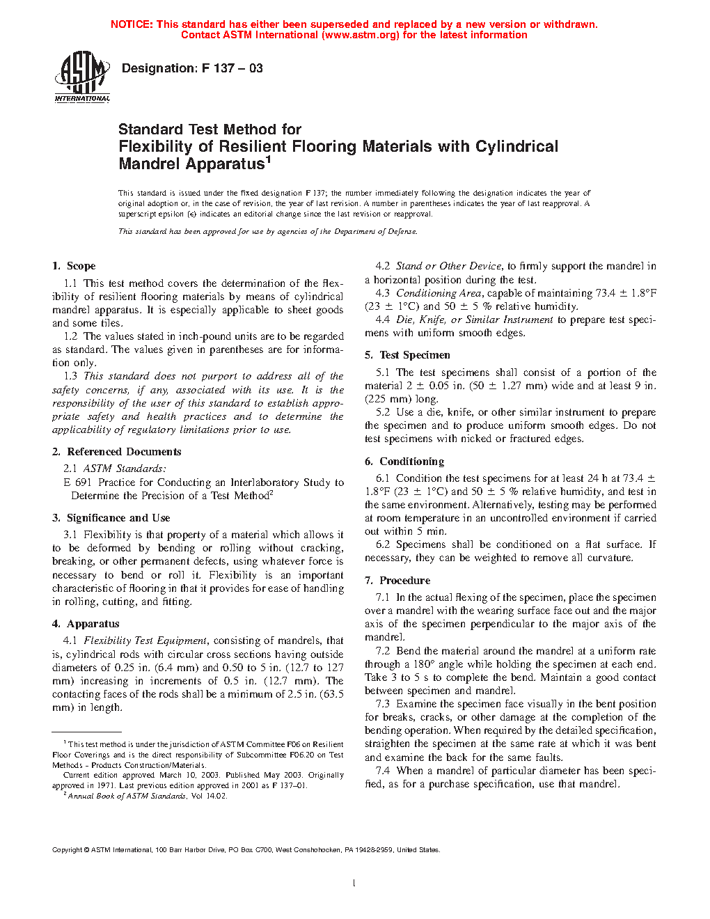 1.1 This test method covers the determination of the flexibility of resilient flooring materials by means of cylindrical mandrel apparatus. It is especially applicable to sheet goods and some tiles.