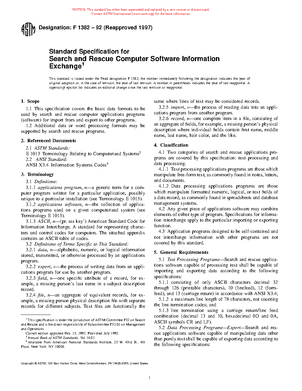 1.1 This specification covers the basic data formats to be used by search and rescue computer applications programs (software) for import from and export to other programs.
