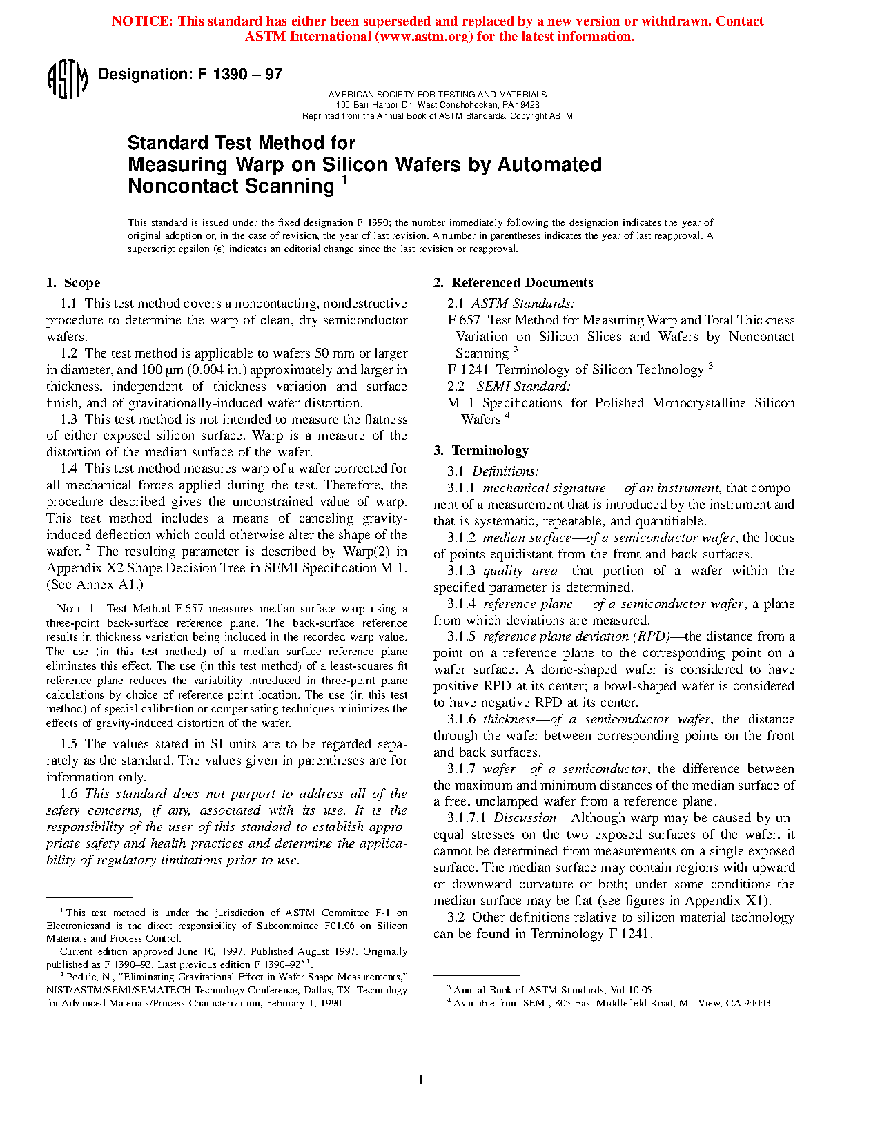 1.4 This test method measures warp of a wafer corrected for all mechanical forces applied during the test. Therefore, the procedure described gives the unconstrained value of warp. This test method includes a means of canceling gravity-induced deflection which could otherwise alter the shape of the wafer. The resulting parameter is described by Warp(2) in Shape Decision Tree in SEMI Specification M 1. (See Annex A1.)