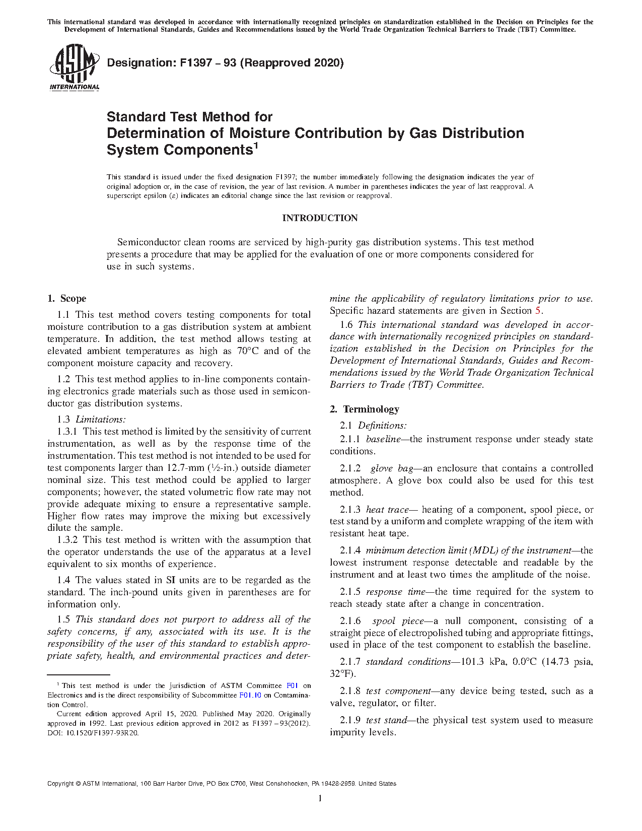 1.1 This test method covers testing components for total moisture contribution to a gas distribution system at ambient temperature. In addition, the test method allows testing at elevated ambient temperatures as high as 70°C and of the component moisture capacity and recovery.