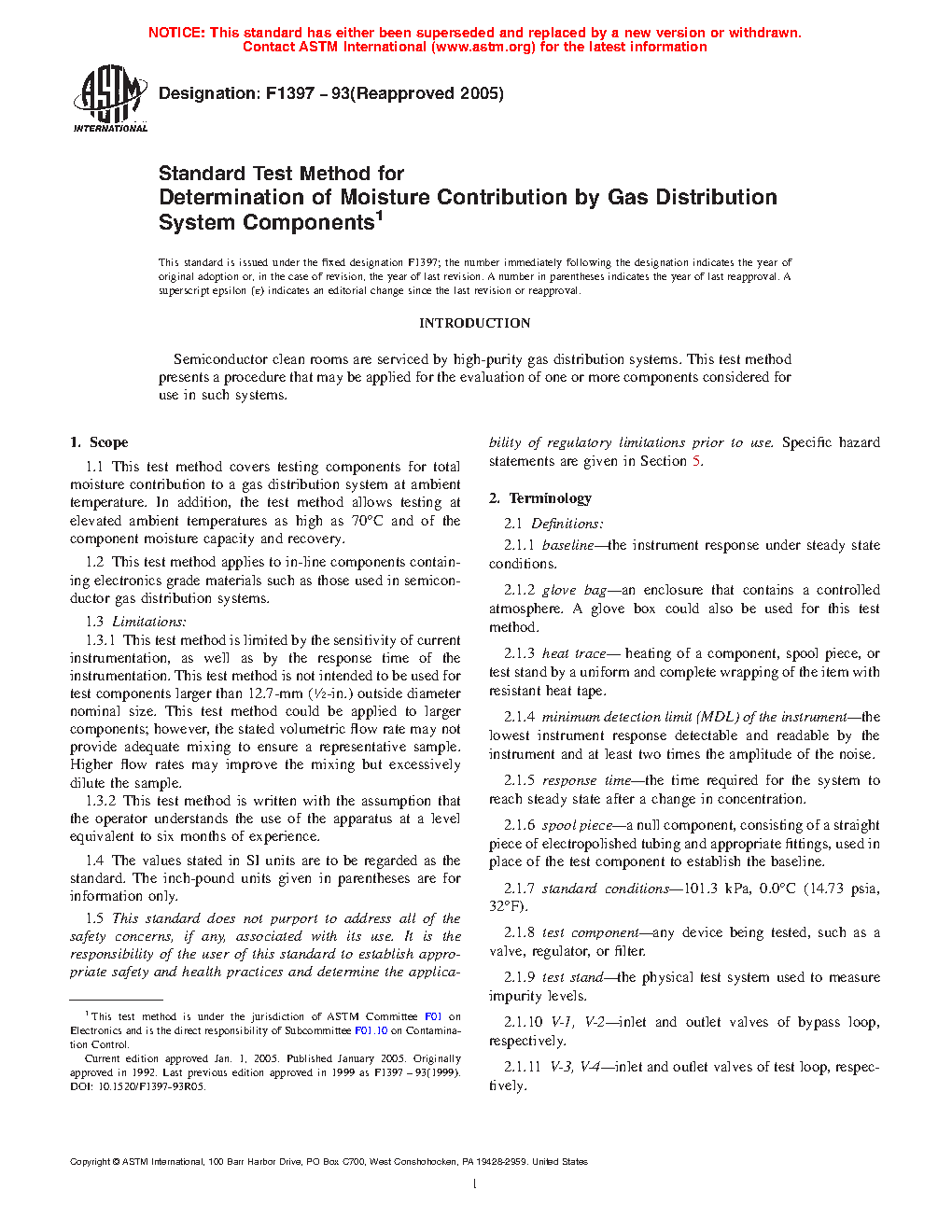 The purpose of this test method is to define a procedure for testing components being considered for installation into a high-purity gas distribution system. Application of this test method is expected to yield comparable data among components tested for the purposes of qualification for this installation.