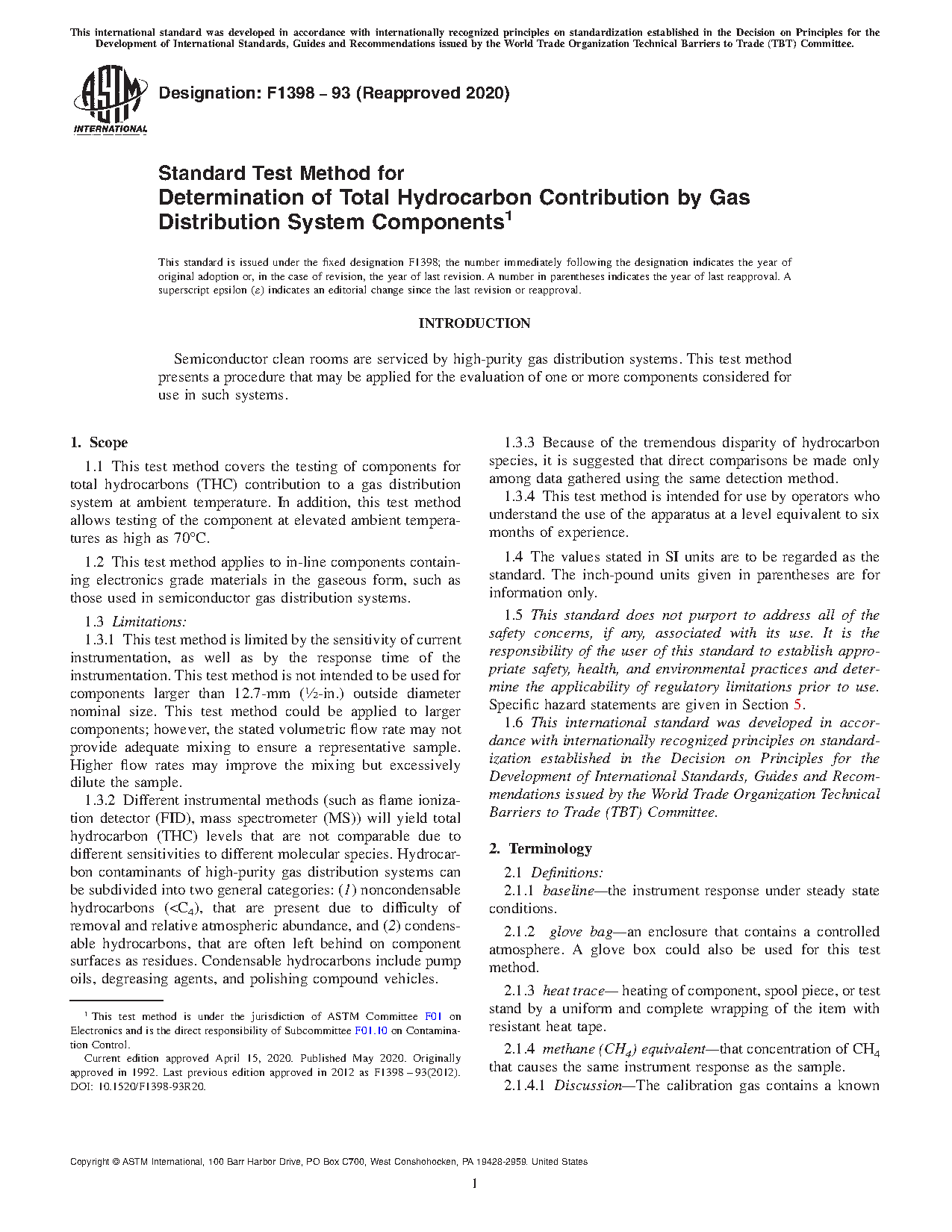 1.3.2 Different instrumental methods (such as flame ionization detector (FID), mass spectrometer (MS)) will yield total hydrocarbon (THC) levels that are not comparable due to different sensitivities to different molecular species. Hydrocarbon contaminants of high-purity gas distribution systems can be subdivided into two general categories: (1) noncondensable hydrocarbons (<C4), that are present due to difficulty of removal and relative atmospheric abundance, and (2) condensable hydrocarbons, that are often left behind on component surfaces as residues. Condensable hydrocarbons include pump oils, degreasing agents, and polishing compound vehicles.