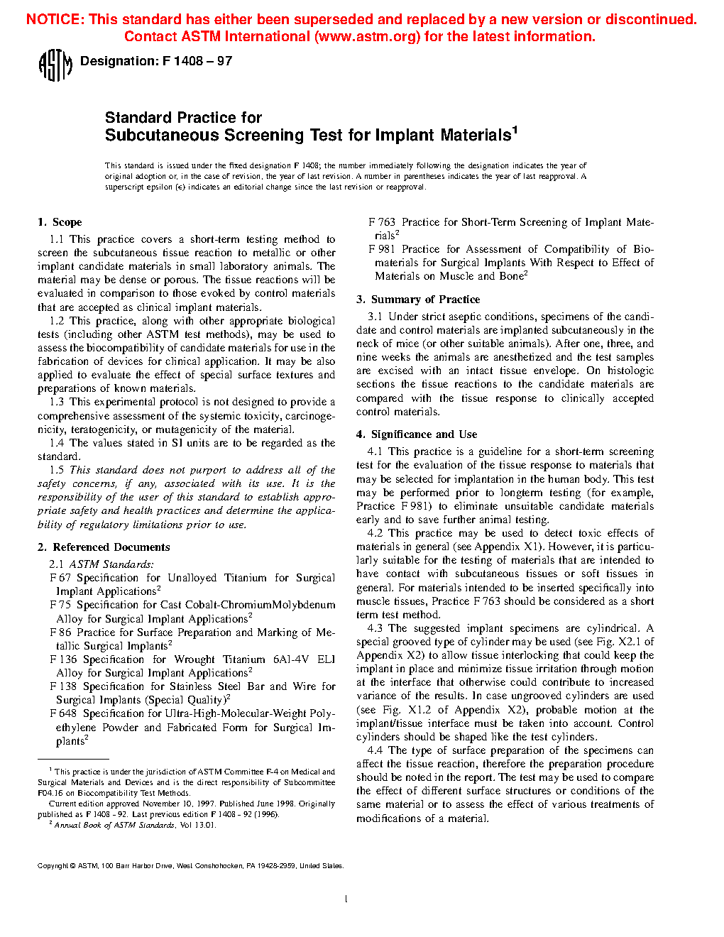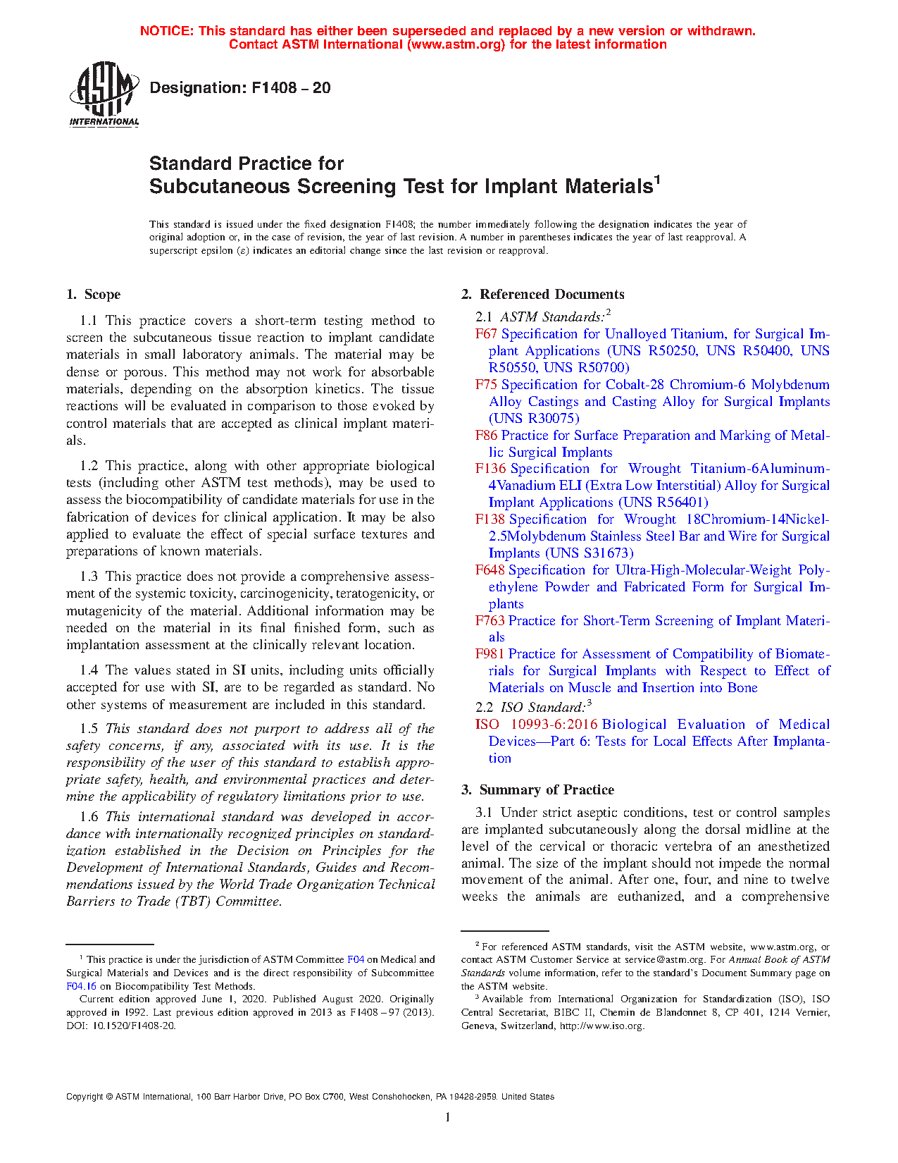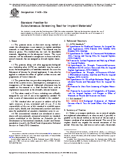 1.1 This practice covers a short-term testing method to screen the subcutaneous tissue reaction to implant candidate materials in small laboratory animals. The material may be dense or porous. This method may not work for absorbable materials, depending on the absorption kinetics. The tissue reactions will be evaluated in comparison to those evoked by control materials that are accepted as clinical implant materials.