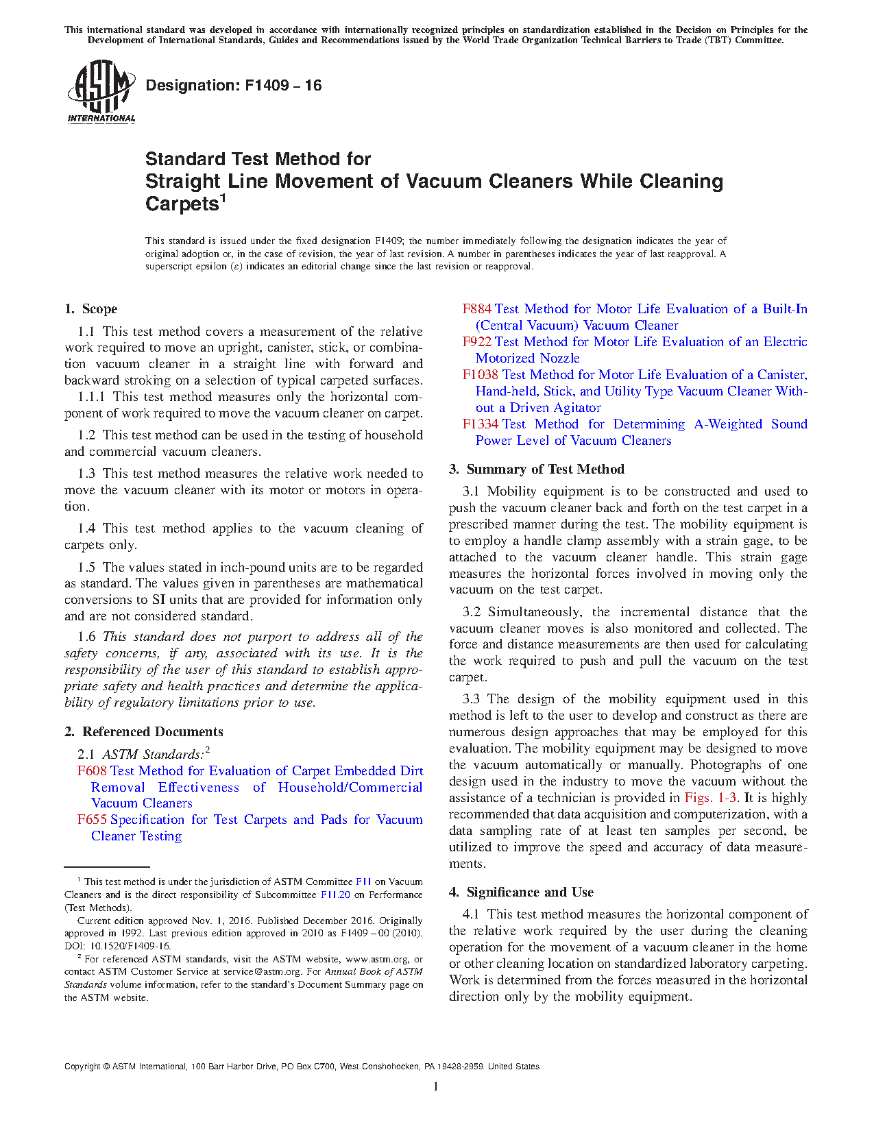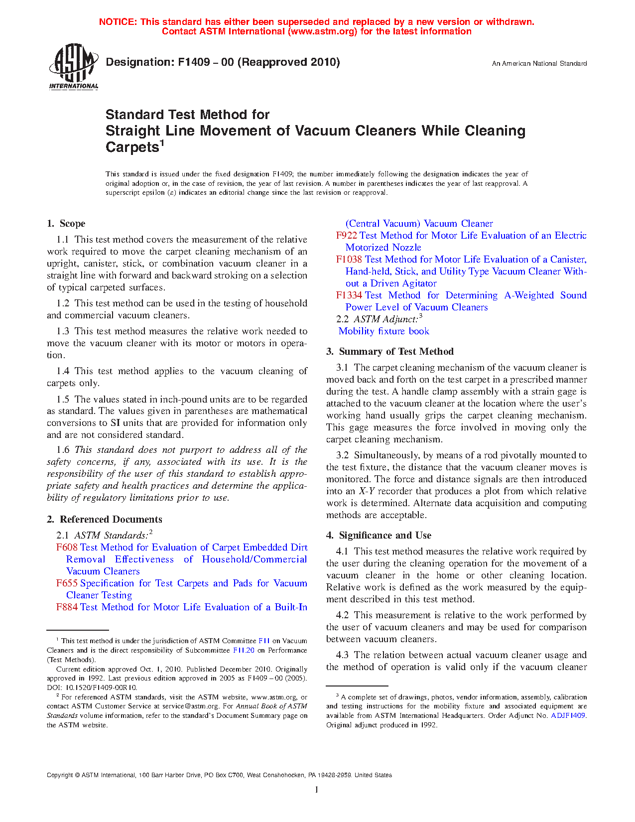 1.3 This test method measures the relative work needed to move the cleaner with its motor or motors in operation.