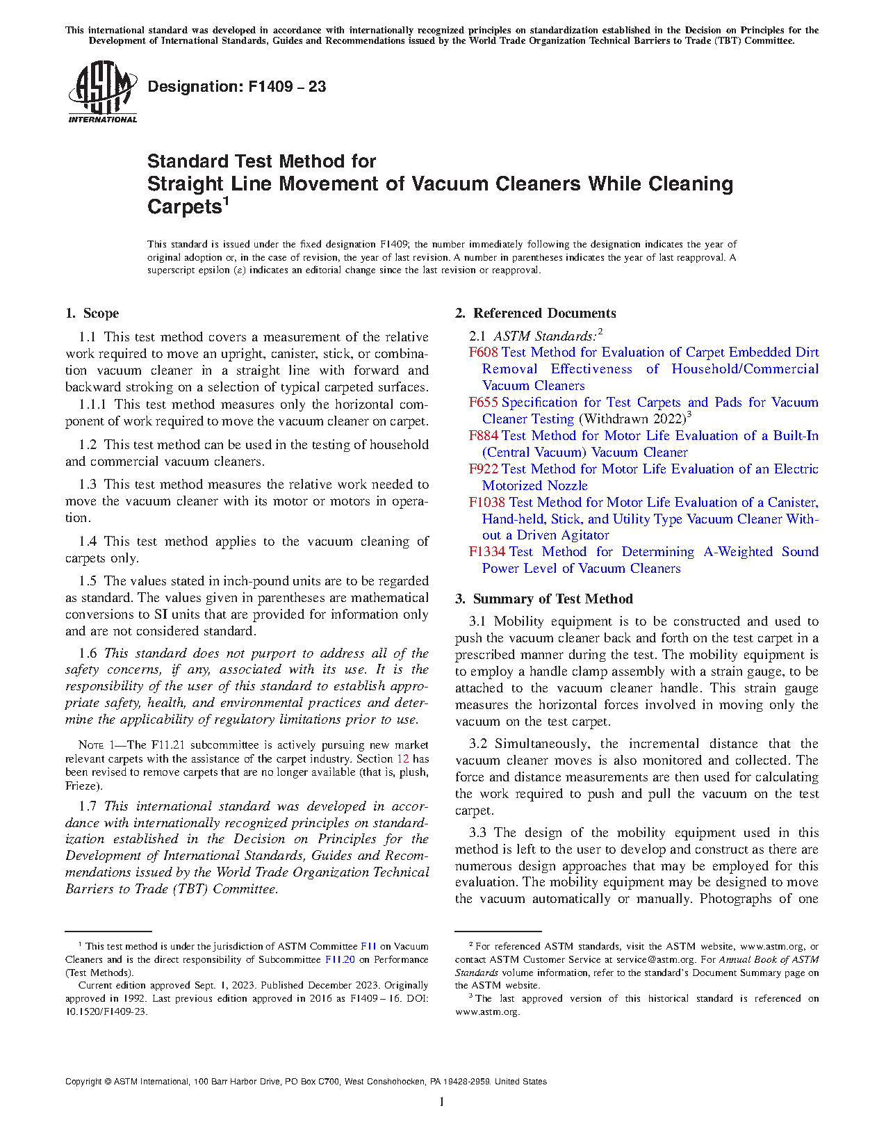 1.1 This test method covers the measurement of the relative work required to move the carpet cleaning mechanism of an upright, canister, stick, or combination vacuum cleaner in a straight line with forward and backward stroking on a selection of typical carpeted surfaces.